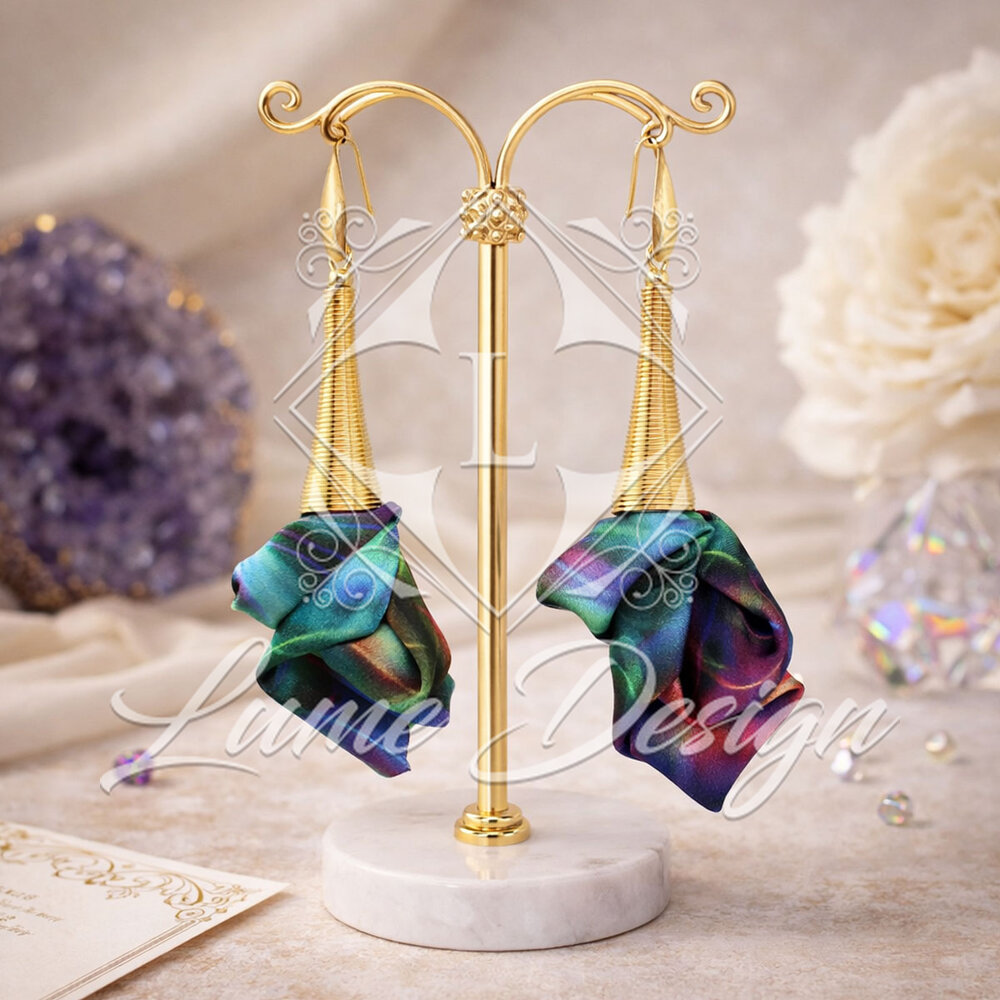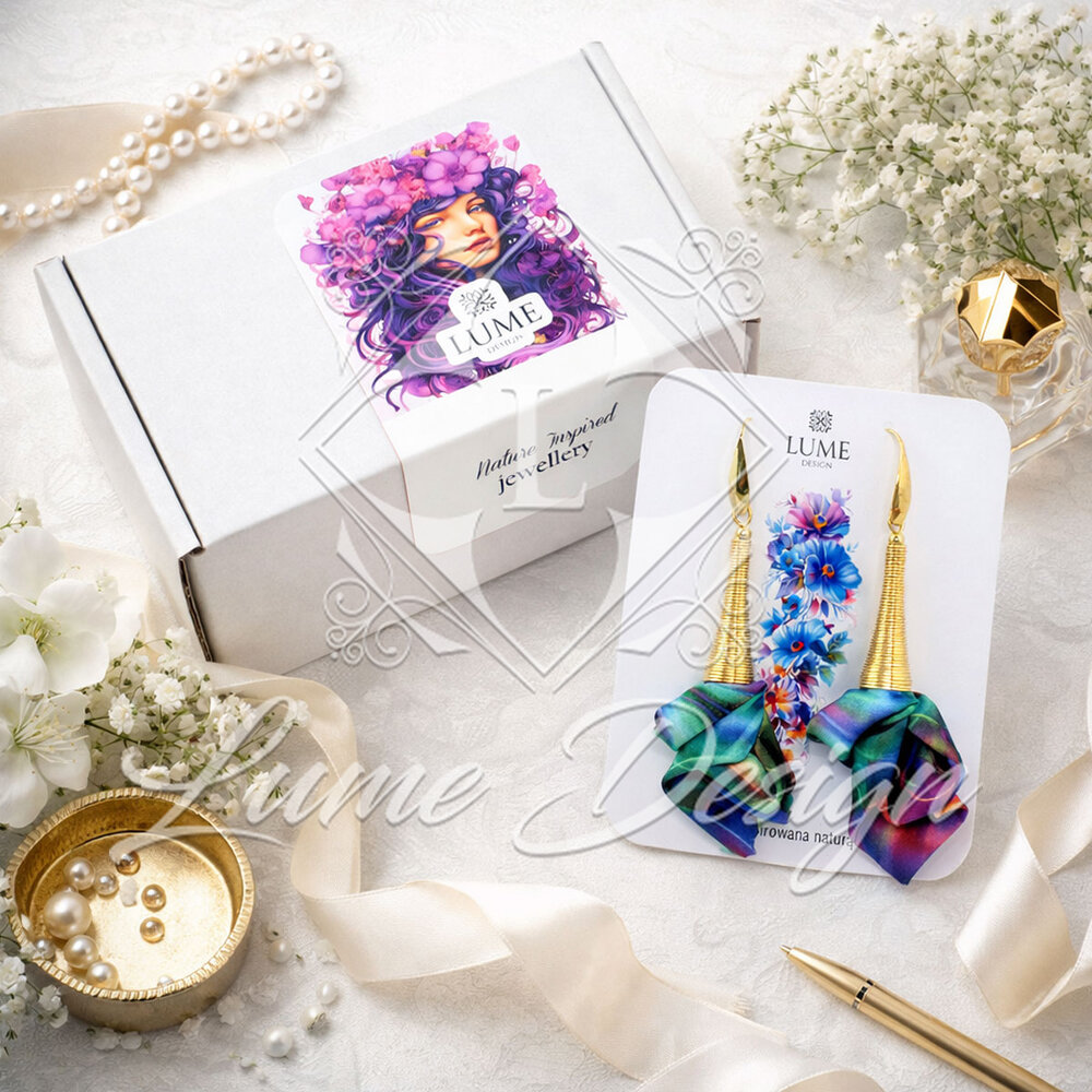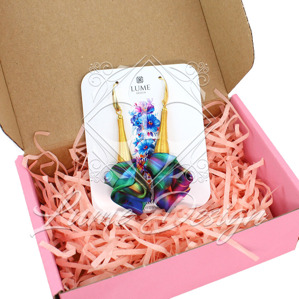 Ważne: Każda para jest jedyna w swoim rodzaju. Otrzymany produkt może różnić się rozkładem kolorów od modelu prezentowanego na zdjęciu, co jest naturalną cechą biżuterii tworzonej z barwionej tkaniny.