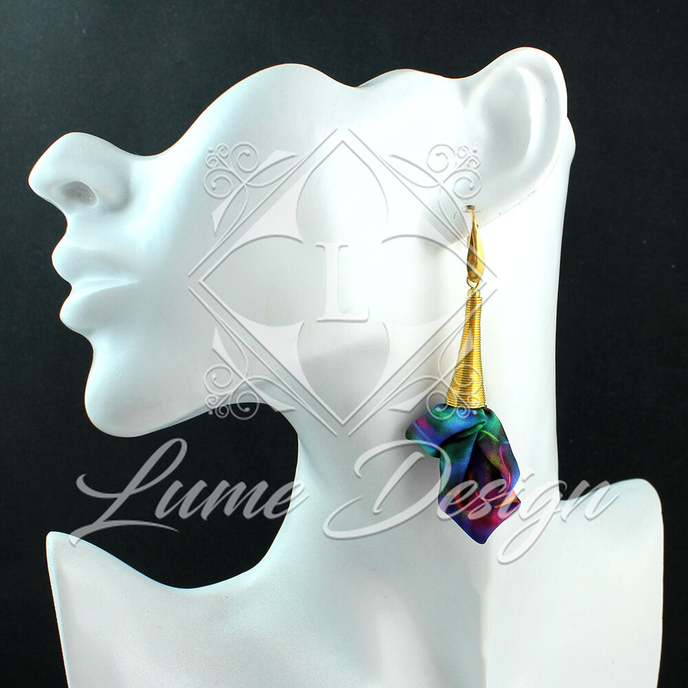Ręcznie robiona biżuteria stworzona dla kobiet, które kochają wyróżniać się unikatowymi dodatkami. Kolczyki zostały wykonane z wielobarwnej tkaniny o nasyconych odcieniach. Ze względu na specyfikę materiału i proces ręcznego tworzenia, każda para posiada swój indywidualny, niepowtarzalny układ barw – poszczególne kolczyki mogą różnić się od siebie przewagą konkretnych kolorów.