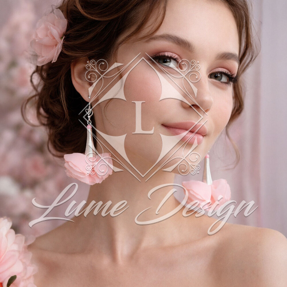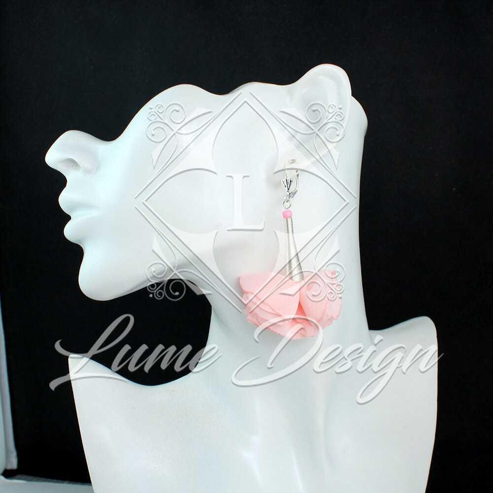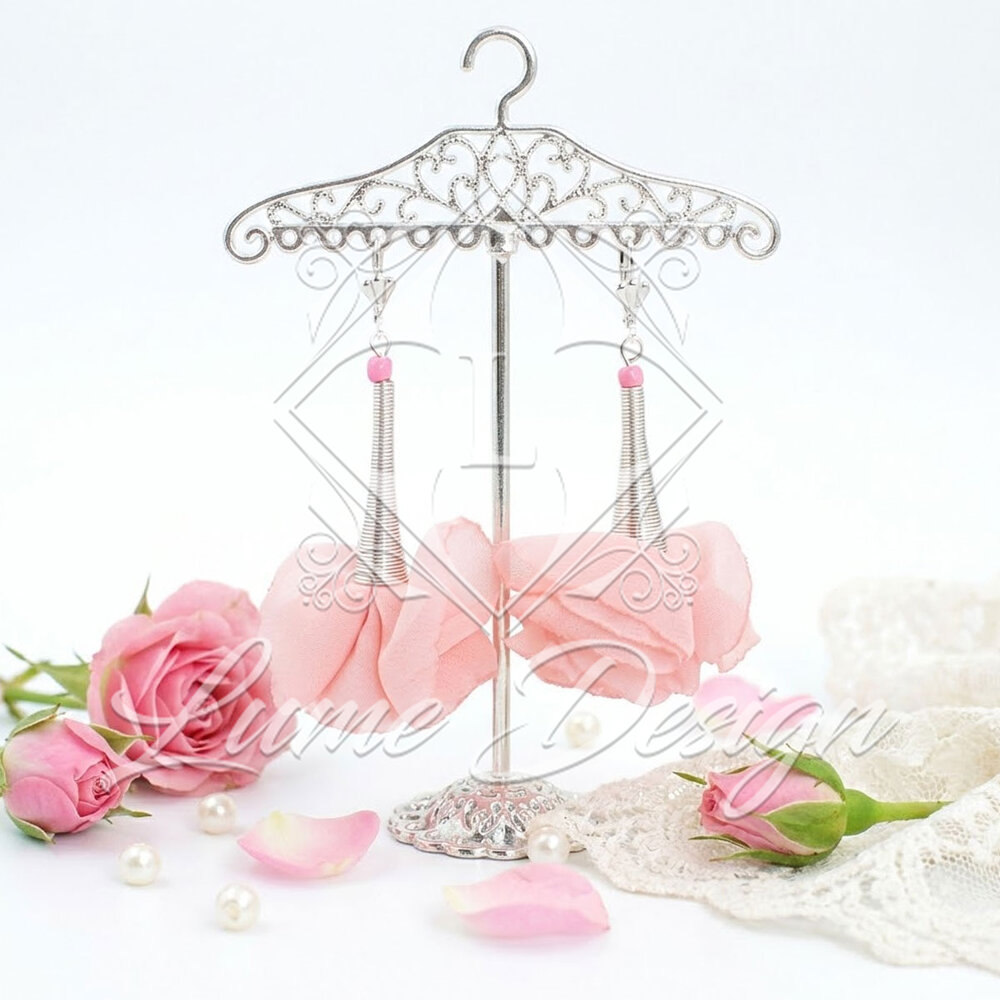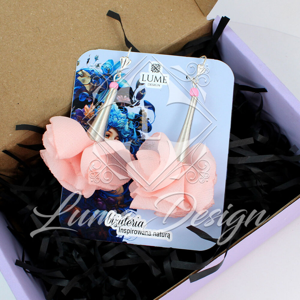 Ręcznie robiona biżuteria, która łączy w sobie subtelność pastelowych barw z eleganckim, srebrnym wykończeniem. Wyjątkowo zwiewna tkanina w odcieniu pudrowego różu sprawia, że kolczyki są eteryczne i niemal niewyczuwalne podczas noszenia, stanowiąc jednocześnie wyrazisty element stylizacji.