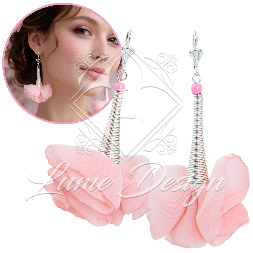 Długie Kolczyki Kwiaty Pudrowy Róż Wiszące Srebrne Bigle Lekkie