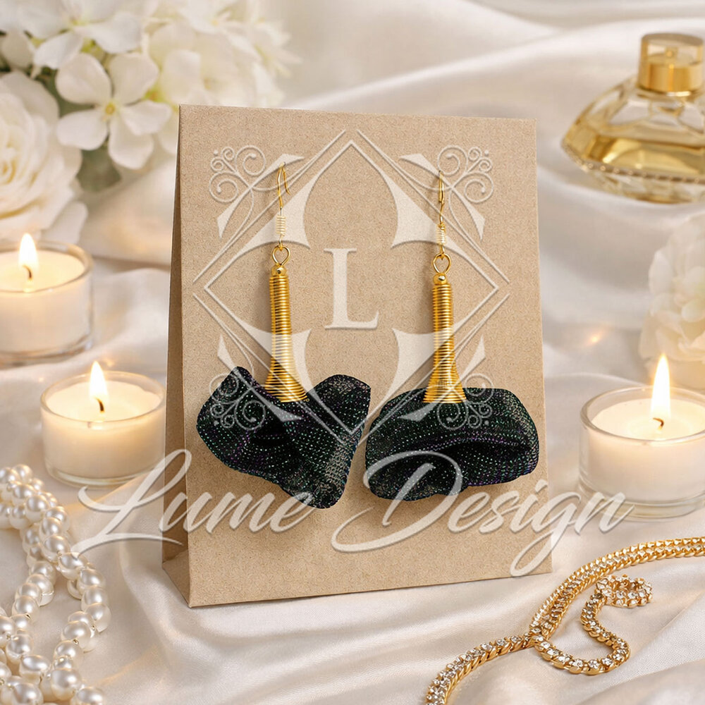 Ręcznie robiona biżuteria od Lume Design, stworzona z unikatowej tkaniny o strukturze siateczki. Materiał ten intryguje nieoczywistą grą barw – mieni się między głęboką, leśną zielenią a tajemniczym fioletem, a wpleciona błyszcząca nitka dodaje całości subtelnego rozświetlenia.