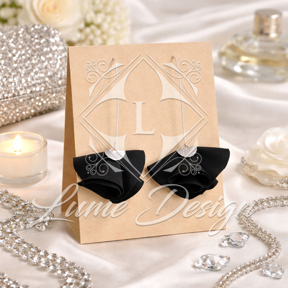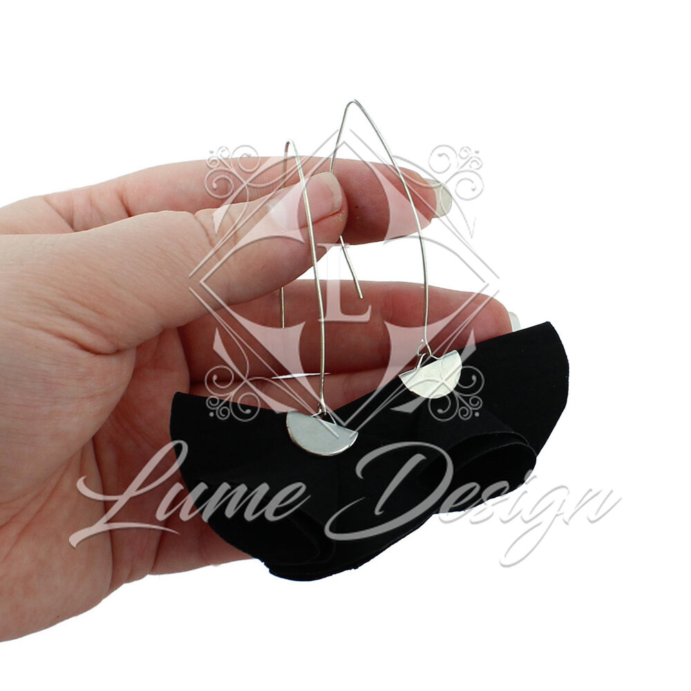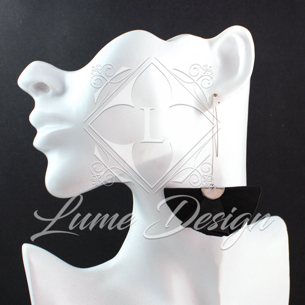 Ręcznie robiona biżuteria, która zachwyca nowoczesną formą i ponadczasową kolorystyką. Model ten charakteryzuje się unikatowym kształtem wachlarza wykonanego z czarnej tkaniny, który w połączeniu z długimi biglami typu „rybki” tworzy spektakularną, a jednocześnie lekką kompozycję.
