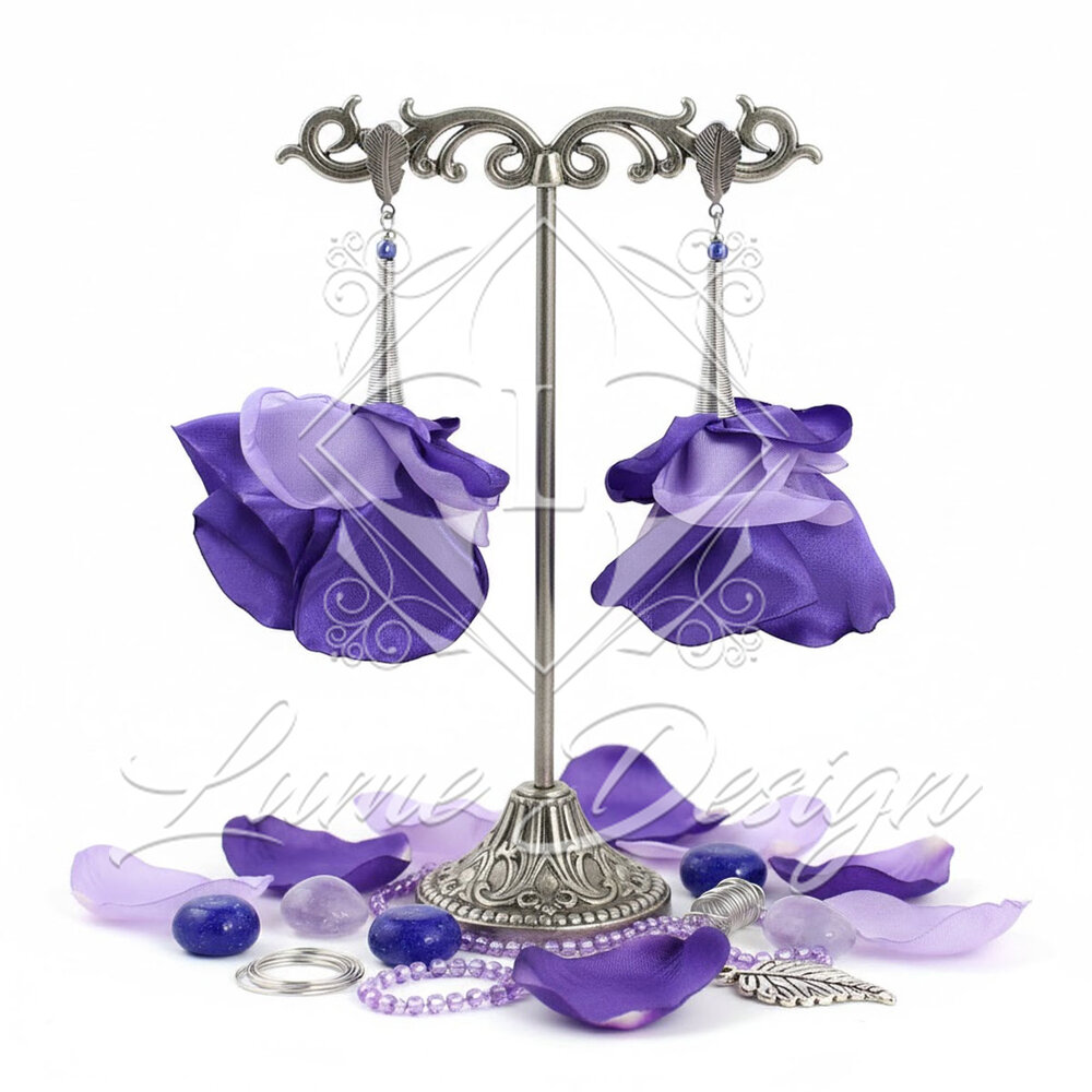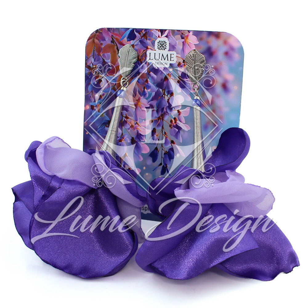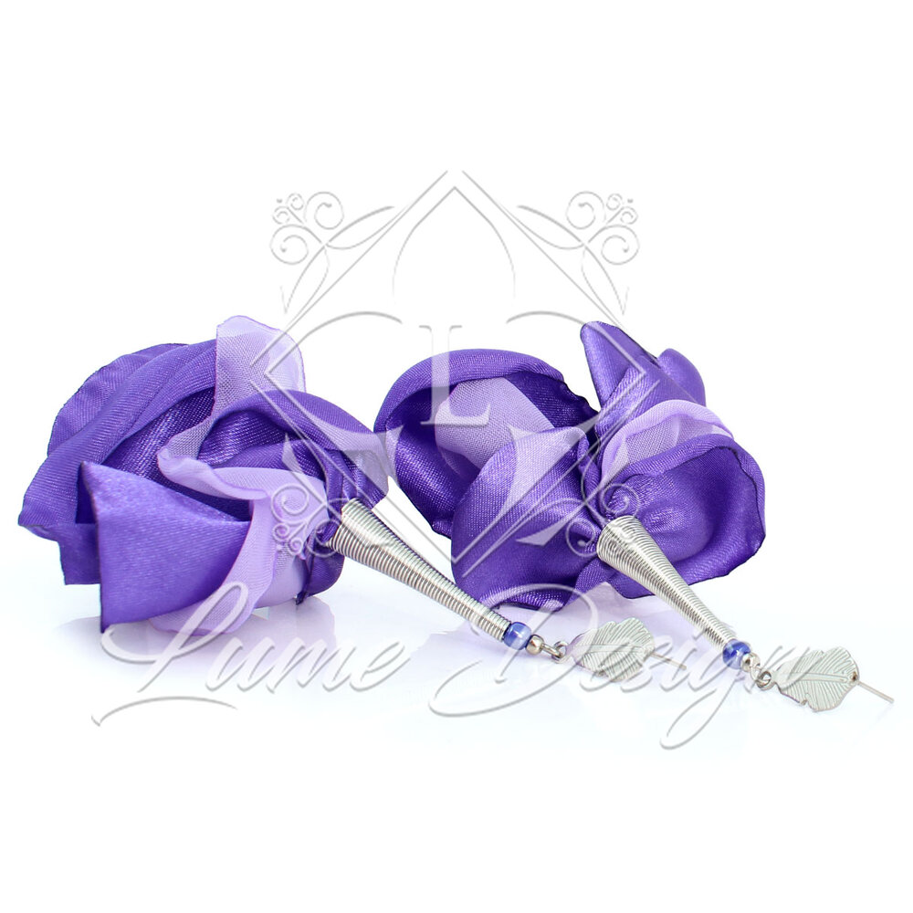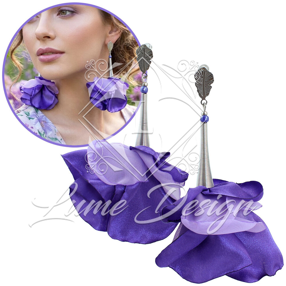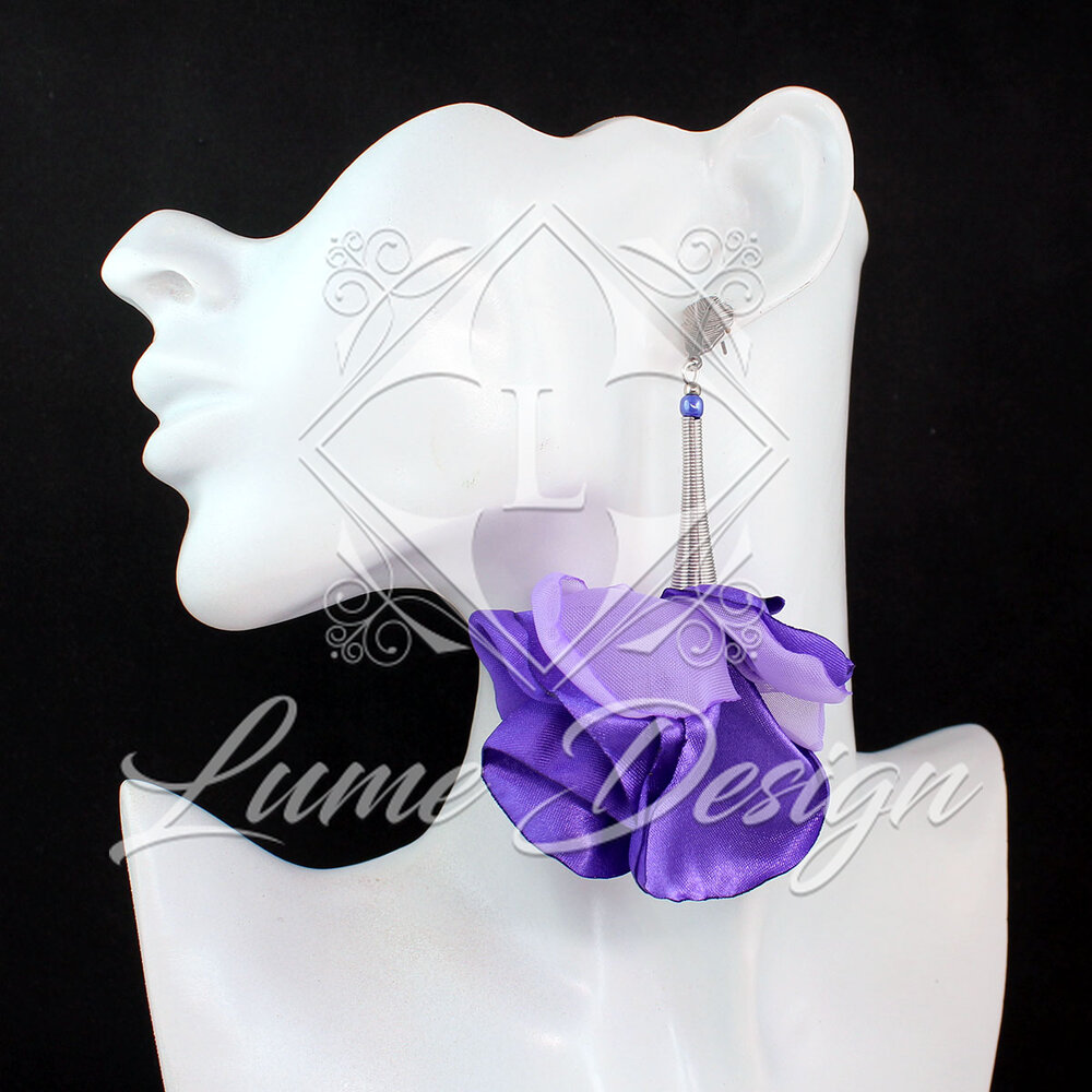 Ręcznie wykonane, okazałe kolczyki kwiaty stworzone z kilku warstw delikatnej tkaniny w różnych odcieniach fioletu – od głębokiego, nasyconego po jaśniejszy, lawendowy ton.