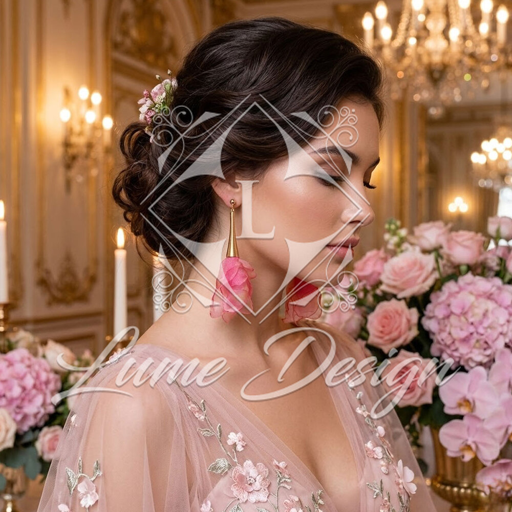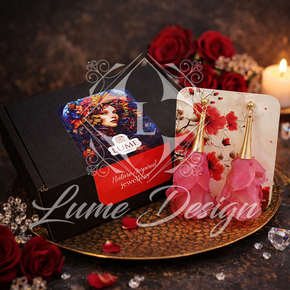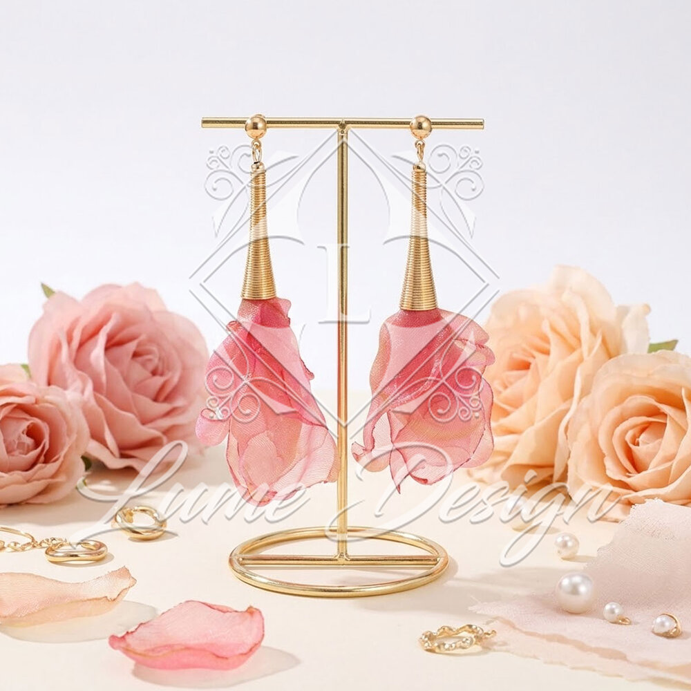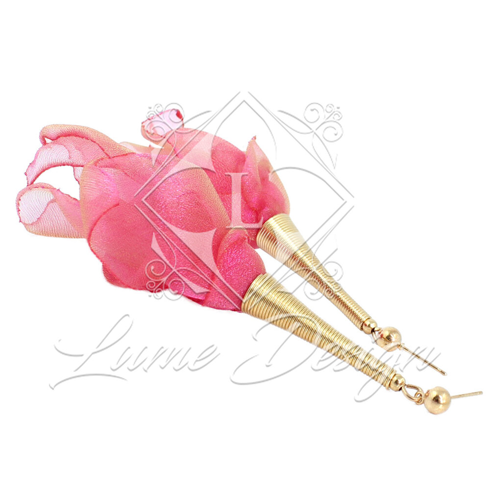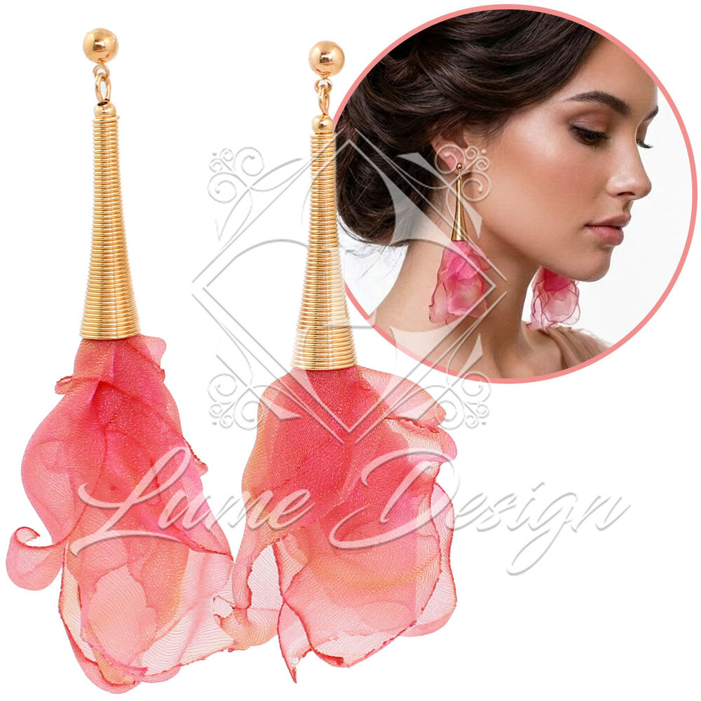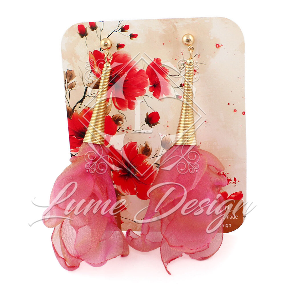 Ręcznie robione kolczyki z delikatnej, zwiewnej tkaniny o wielokolorowym połysku. W świetle pojawiają się odcienie pomarańczu, czerwieni, różu i żółci.