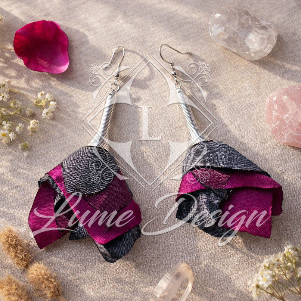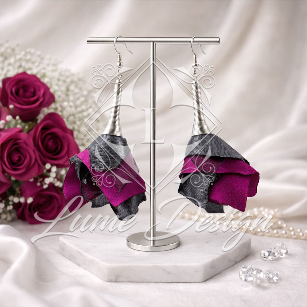 Długie kolczyki kwiaty z tkaniny w odcieniach fuksji i szarości