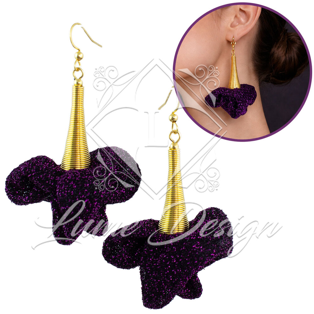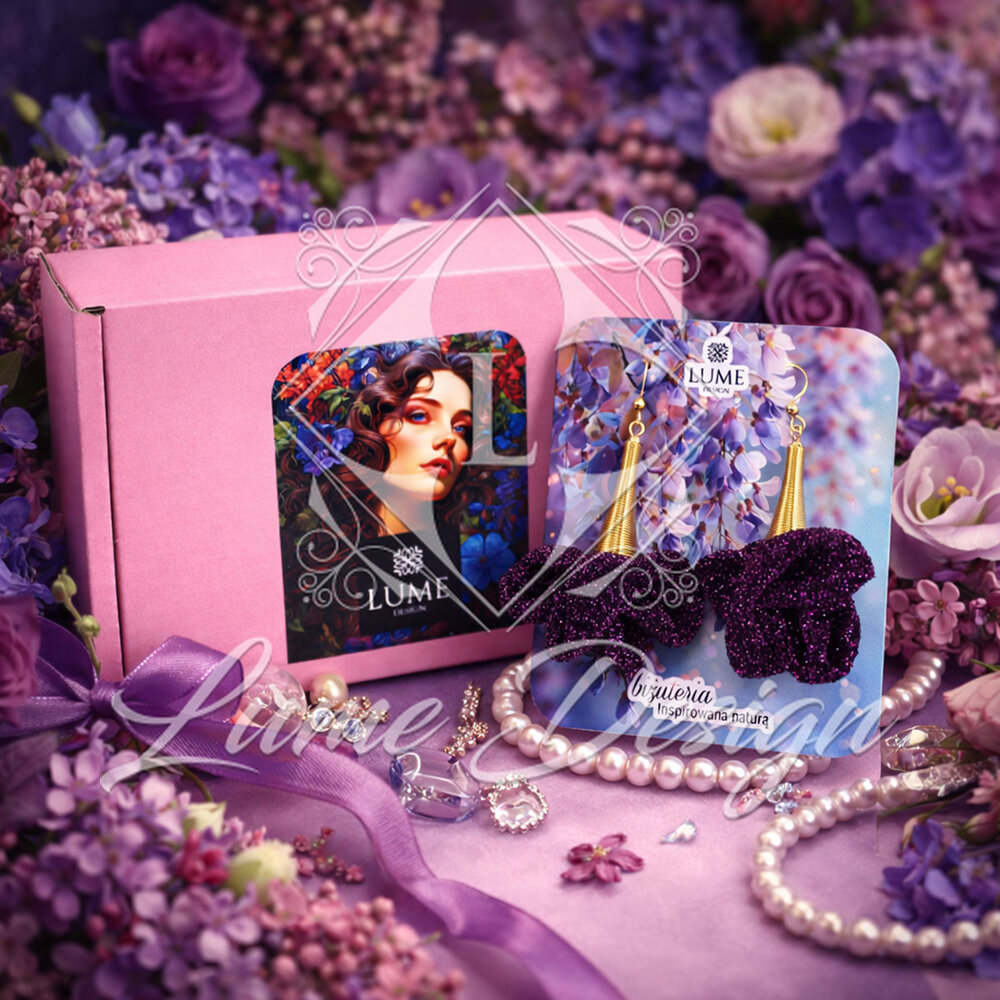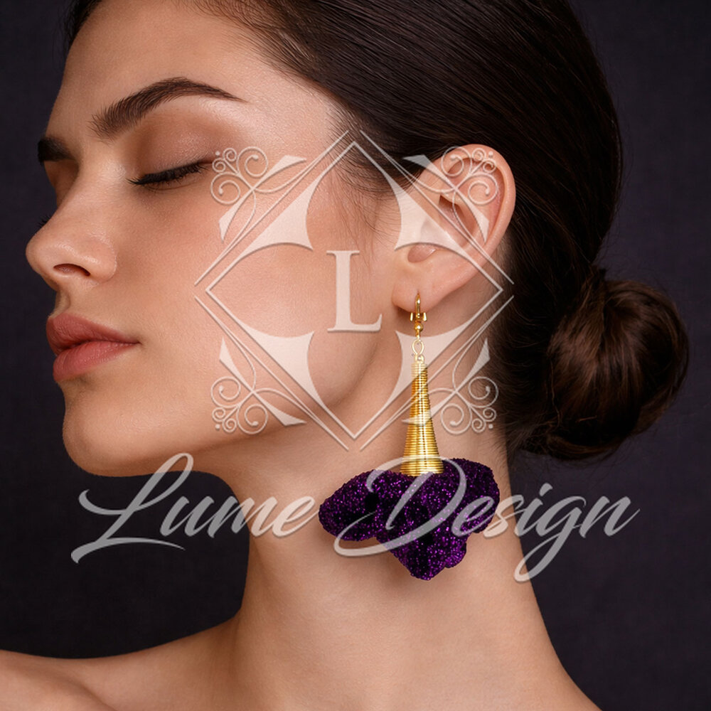 Ręcznie wykonane kolczyki z delikatnej, lekkiej tkaniny w kolorze ciemnego fioletu, która subtelnie mieni się w świetle.