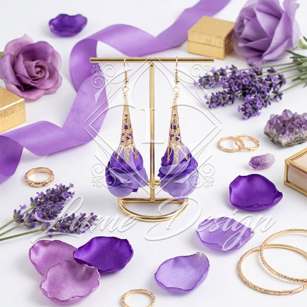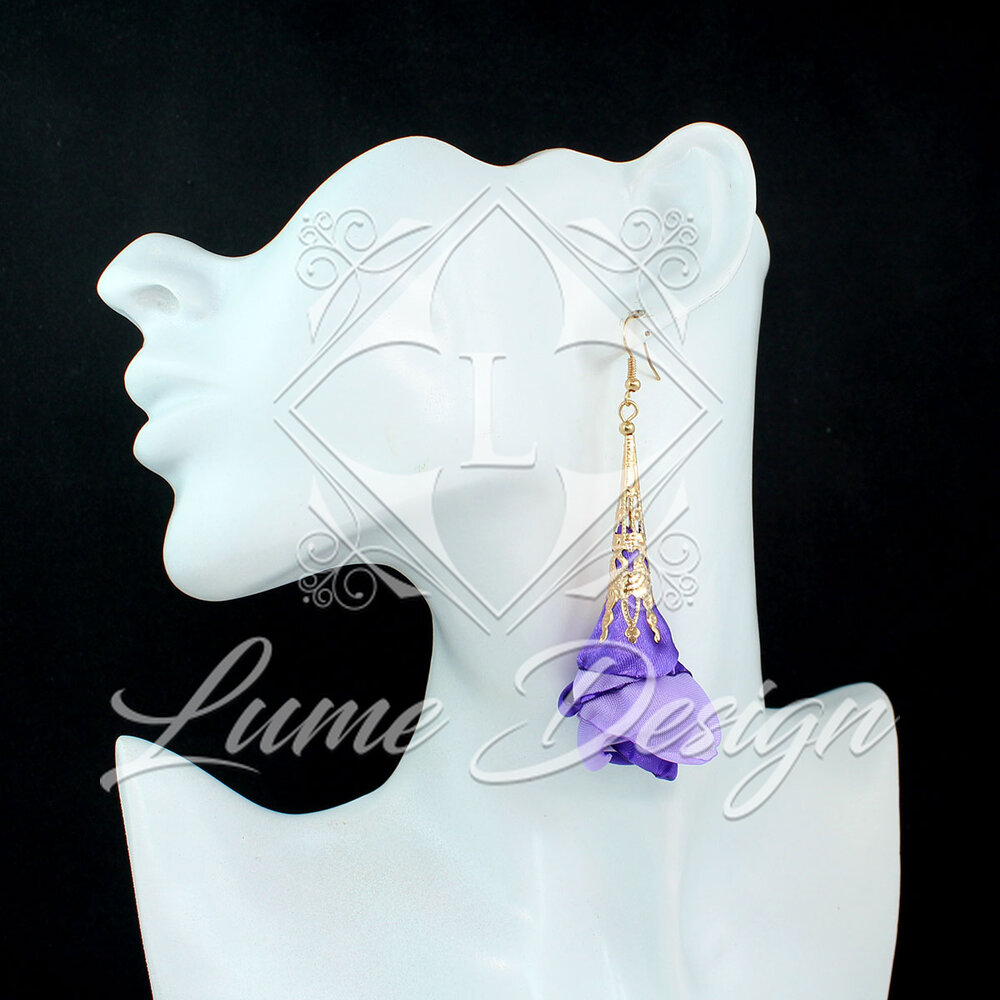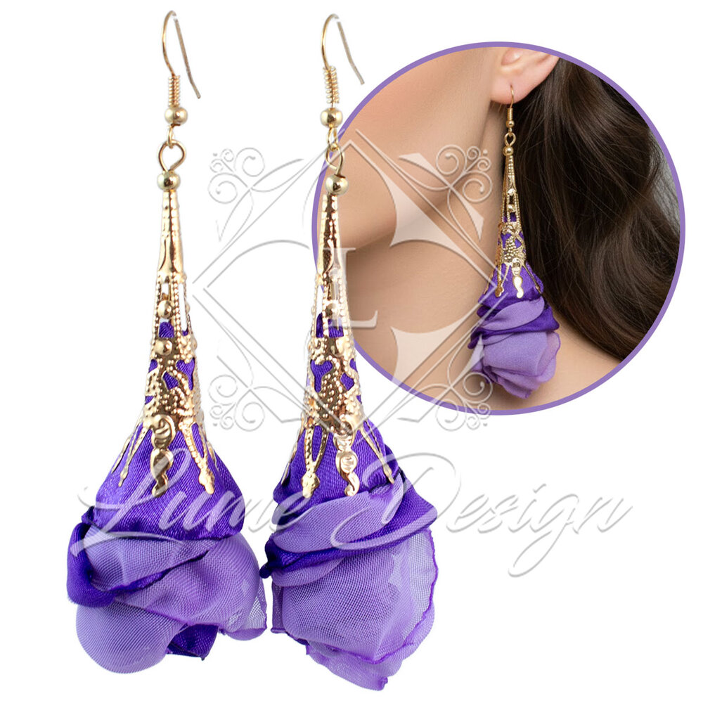 Kolczyki wiszące długie fioletowe ażurowe kwiaty z tkaniny złote
