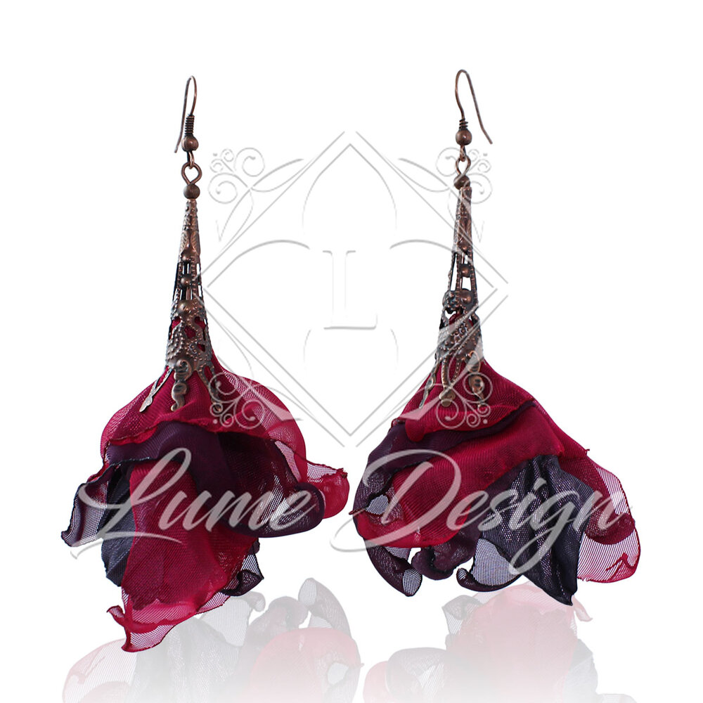 Kolczyki wiszące długie kwiaty fiolet malinowe materiałowe boho witchy lekkie