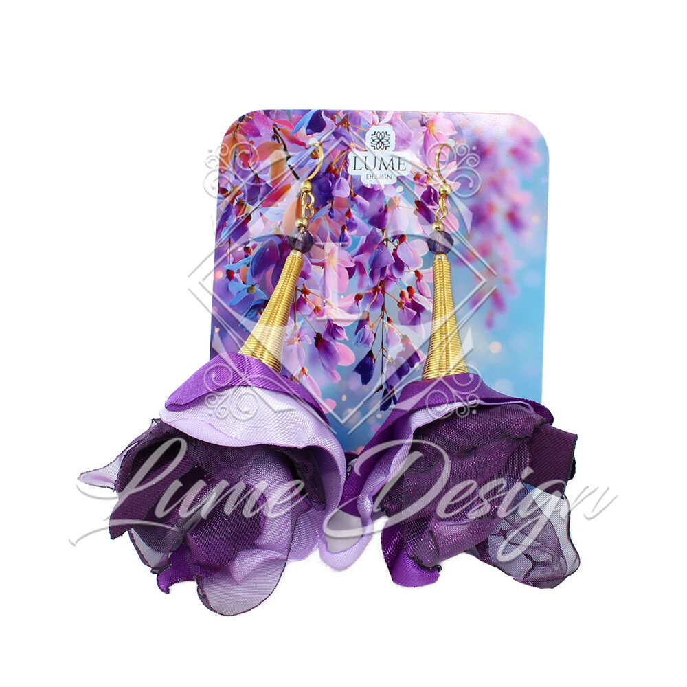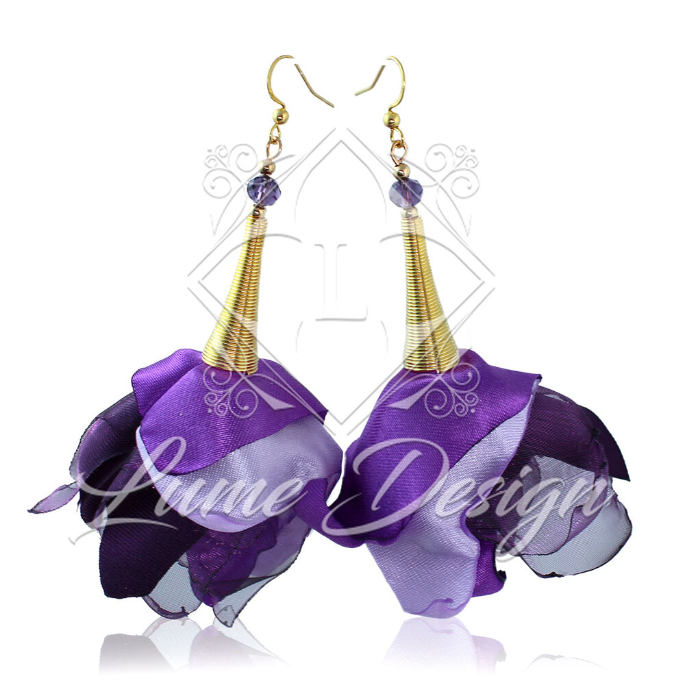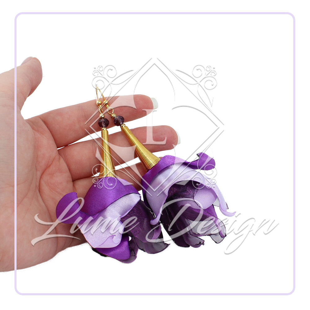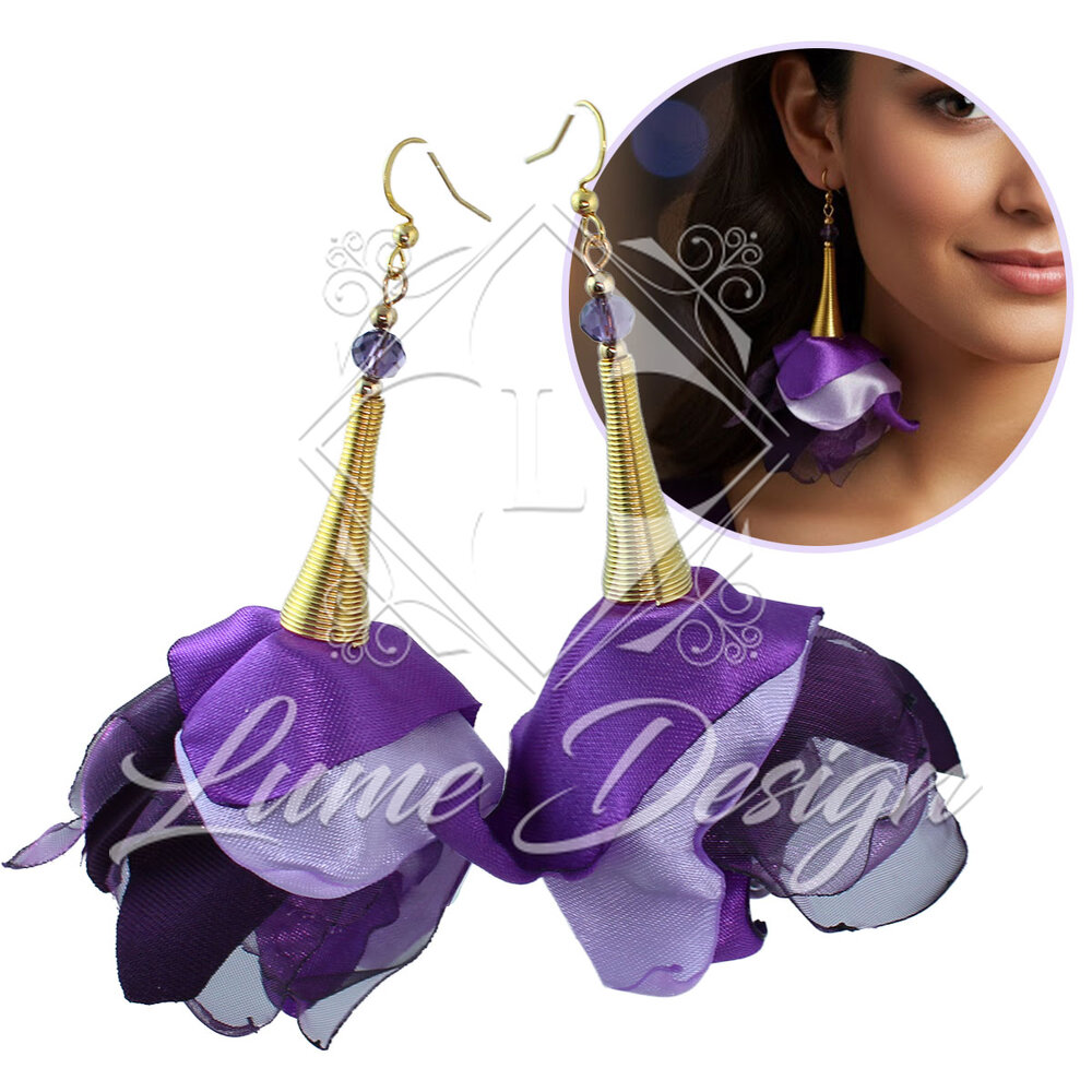 Kolczyki wiszące długie kwiaty fiolet materiałowe boho złote duże