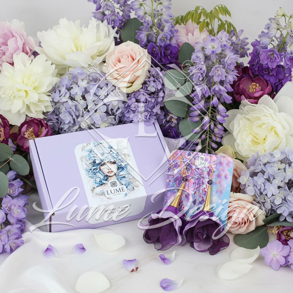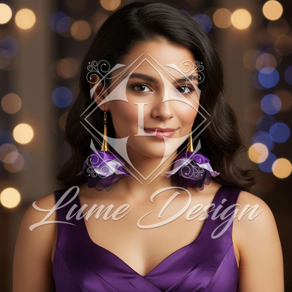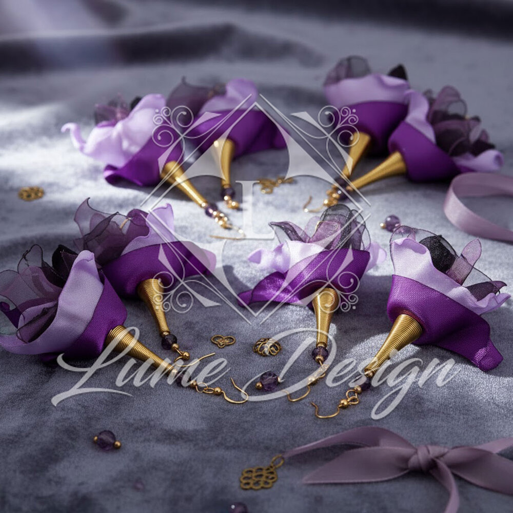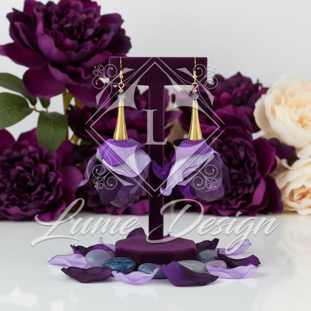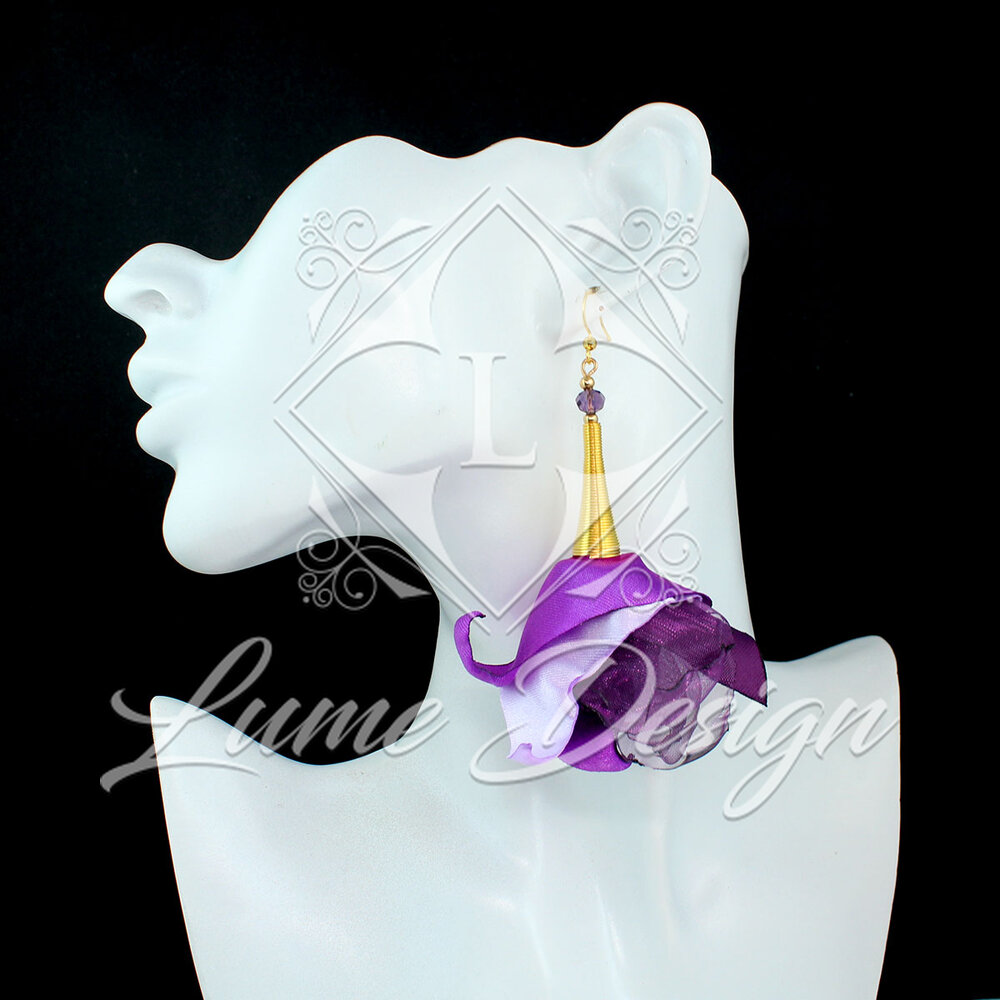 Ręcznie wykonane kolczyki z różnych tkanin w intensywnych fioletowych tonach z dodatkiem jasnej lawendy.