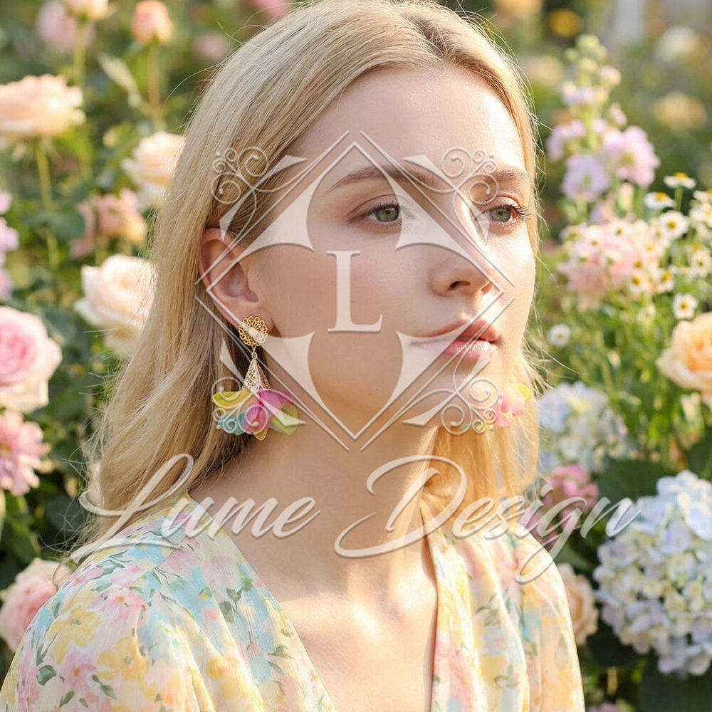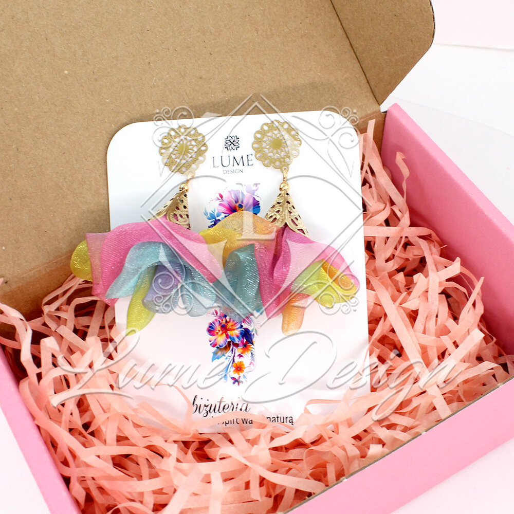 Ręcznie robione kolczyki z delikatnej, zwiewnej tkaniny w pastelowej, wielokolorowej kompozycji. Lekkie, kobiece i subtelne – dodają stylizacji świeżości, koloru i letniego charakteru.