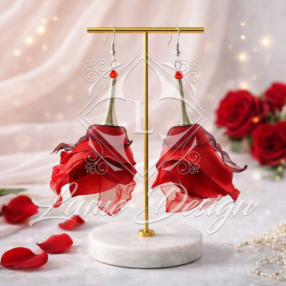 Ręcznie robione kolczyki z tkaniny, które przyciągają spojrzenia niczym wirująca suknia tancerki flamenco. To lekka i wyrazista biżuteria materiałowa, łącząca w sobie zwiewność materiału z artystyczną, przestrzenną formą.