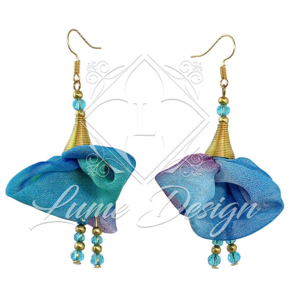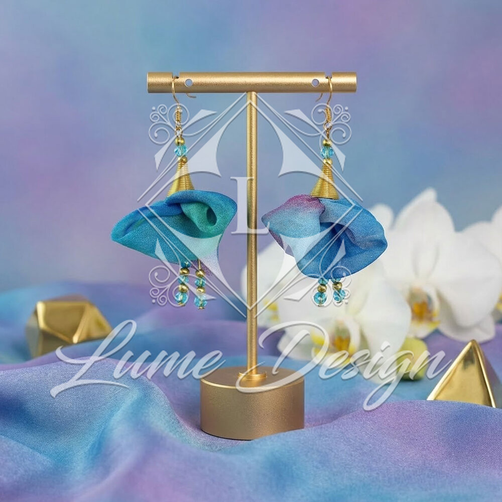 Ręcznie robiona biżuteria, która celebruje niepowtarzalność. Kolczyki zostały wykonane z wielobarwnej tkaniny z przewagą odcieni niebieskiego.