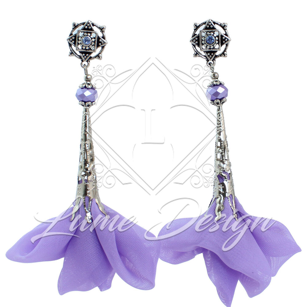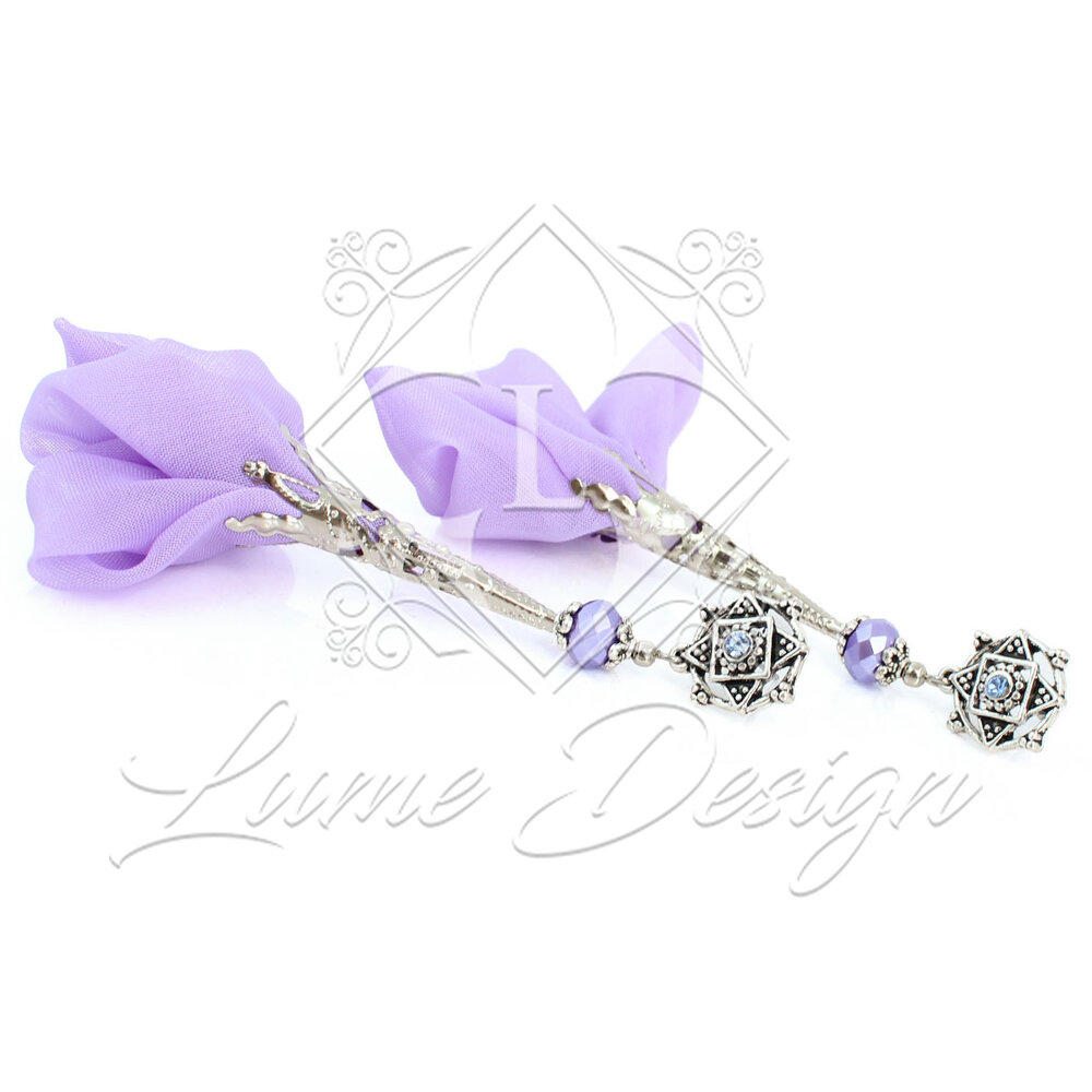 Ręcznie robione kolczyki z delikatnej, zwiewnej tkaniny w kolorze wrzosowo / lawendowym. Subtelne, lekkie i kobiece – dodają stylizacji romantycznego, eleganckiego charakteru.