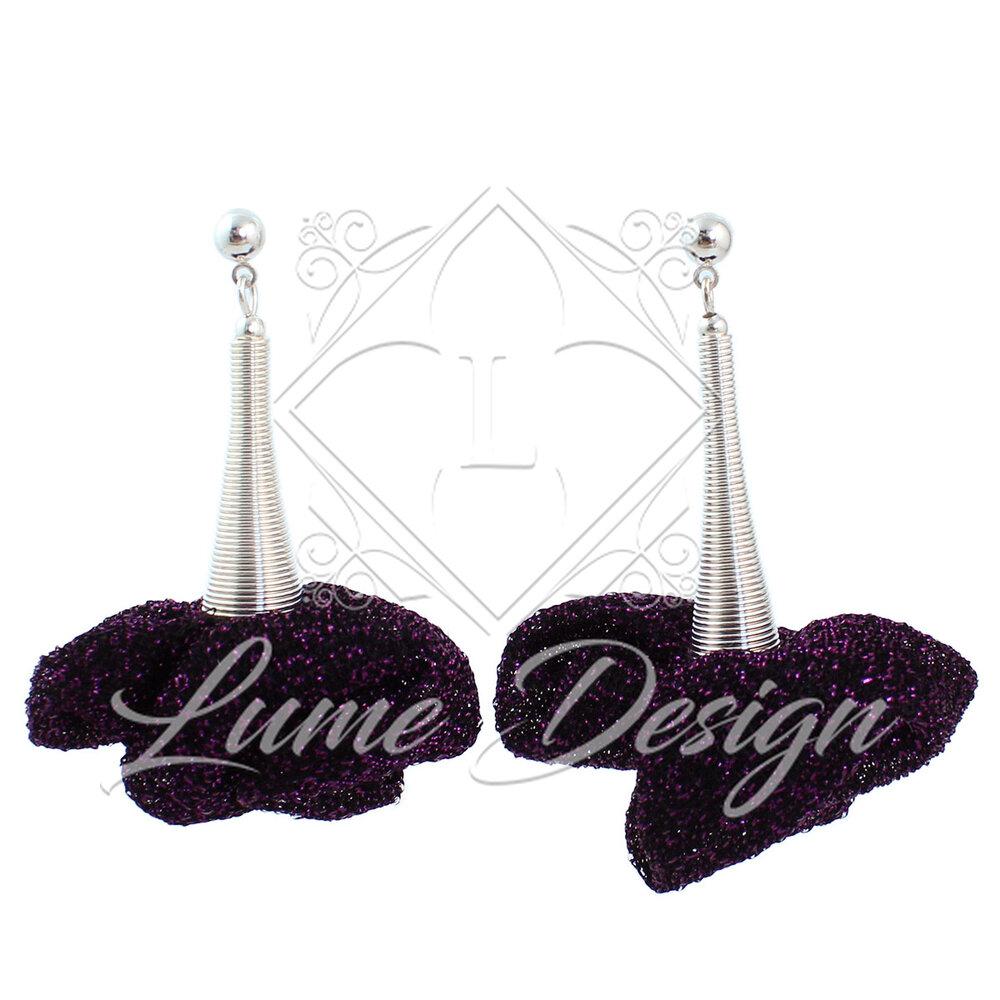 Ręcznie robione kolczyki połyskującej tkaniny w odcieniu ciemnego fioletu z subtelnymi drobinkami różu / fioletu.