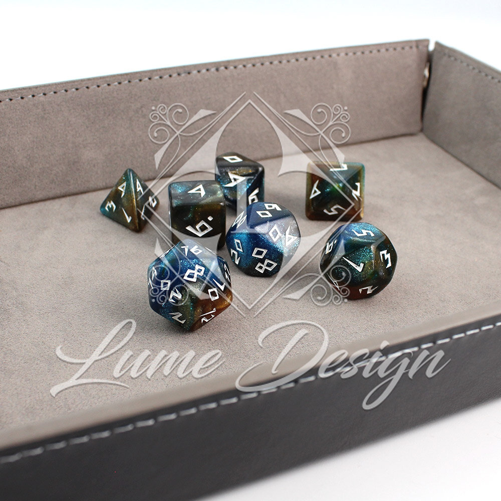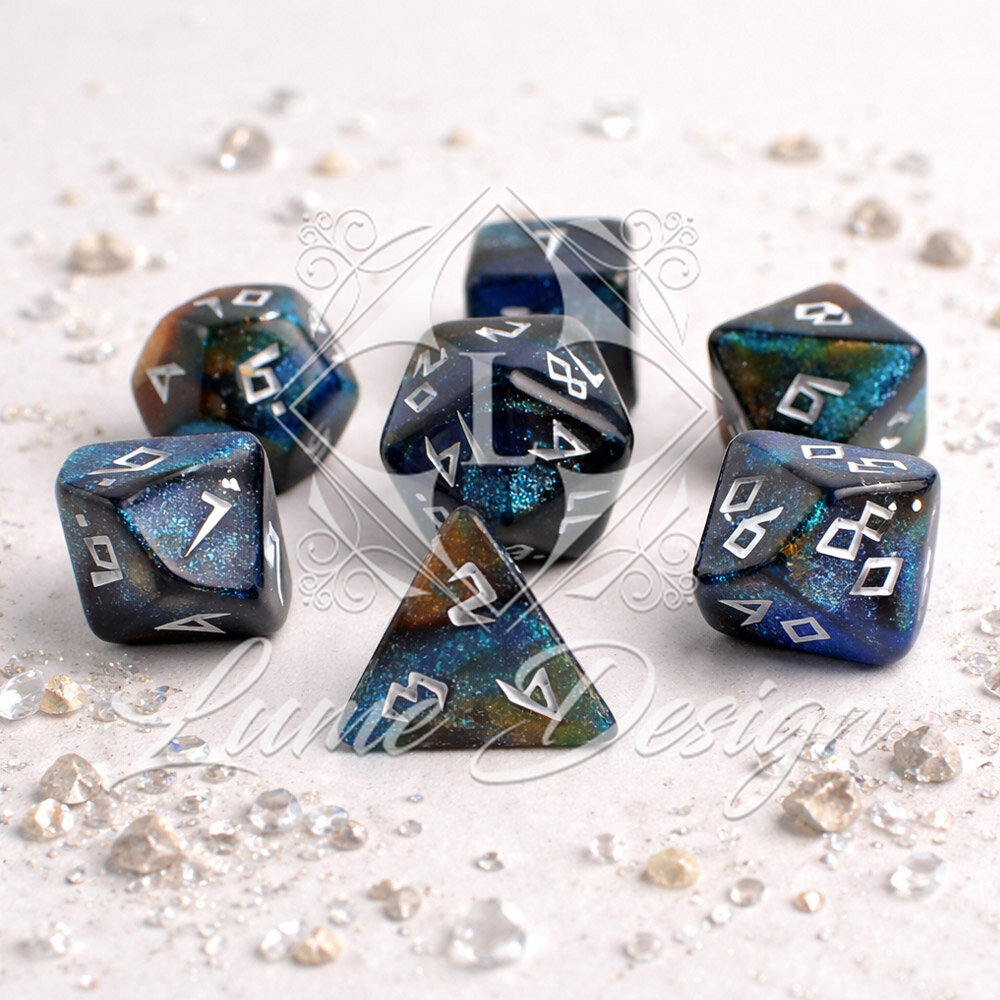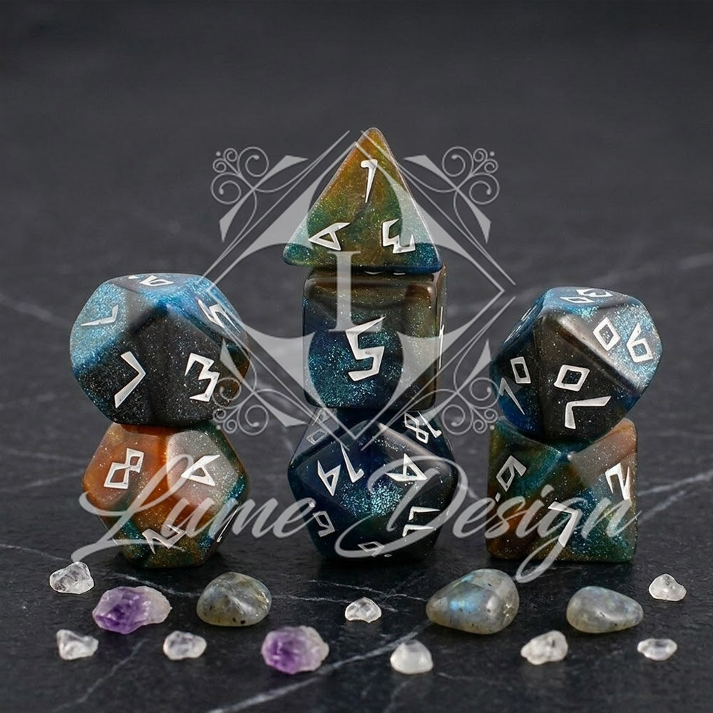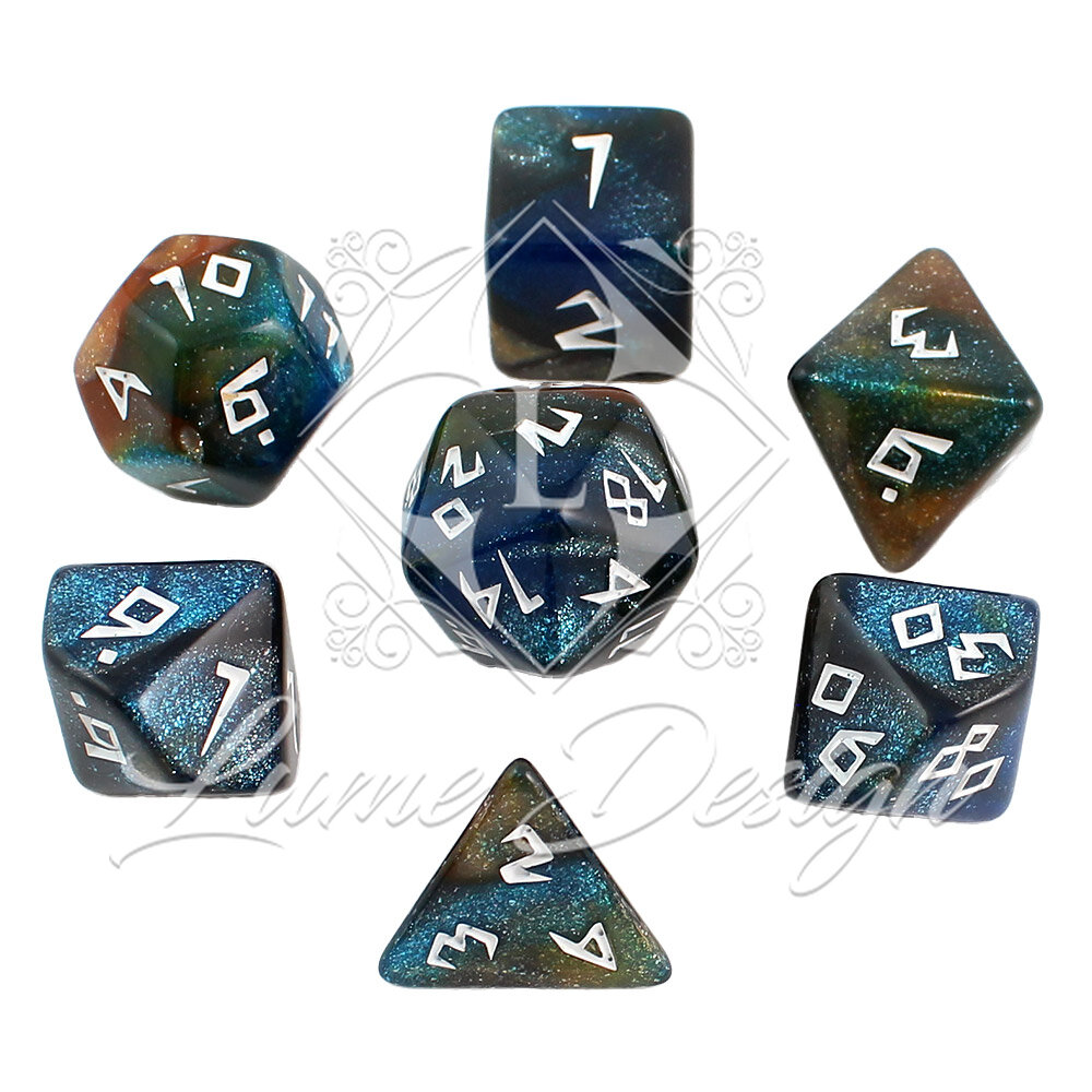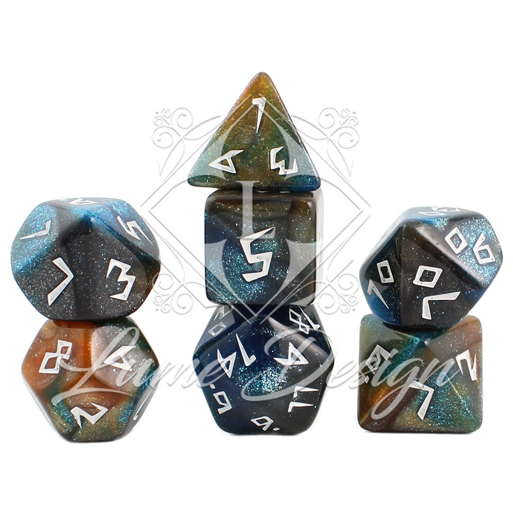 Budżetowy, ale pełen detali zestaw 7 kości wielościennych do gier fabularnych RPG.