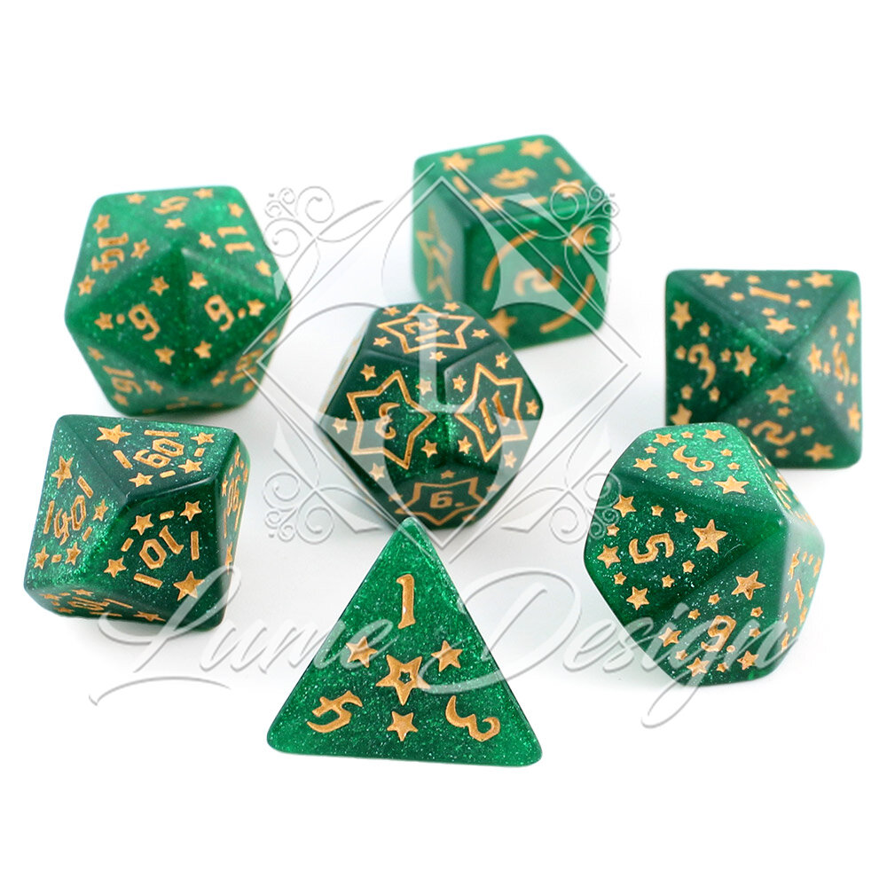 Wyobraź sobie nocne niebo obserwowane z samego serca elfiego lasu. Szmaragdowa zieleń mchu i koron drzew miesza się z blaskiem odległych konstelacji. Zestaw Emerald Stars to odrobina tego magicznego, leśnego kosmosu zamknięta w poręcznych kościach. Niezwykle przyjemne dla oka przyniosą szczęście zarówno początkującym łowcom przygód, jak i weteranom.