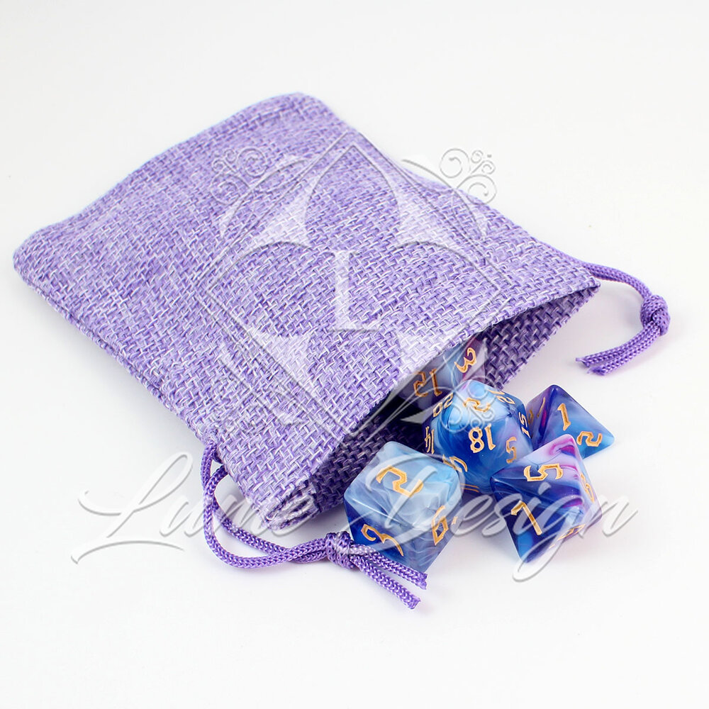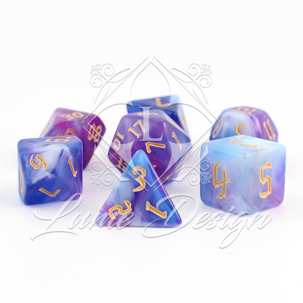 Te kości wyglądają, jakby wyrzeźbiono je z wieczornej mgły lub oparów eliksiru uwarzonego przez mistrza alchemii. Przenikające się barwy budują aurę tajemnicy, snu i iluzji. To zestaw, który nie narzuca się swoją formą, ale hipnotyzuje przy każdym rzucie, przypominając, że w świecie fantasy nic nie jest do końca takie, jakim się wydaje.