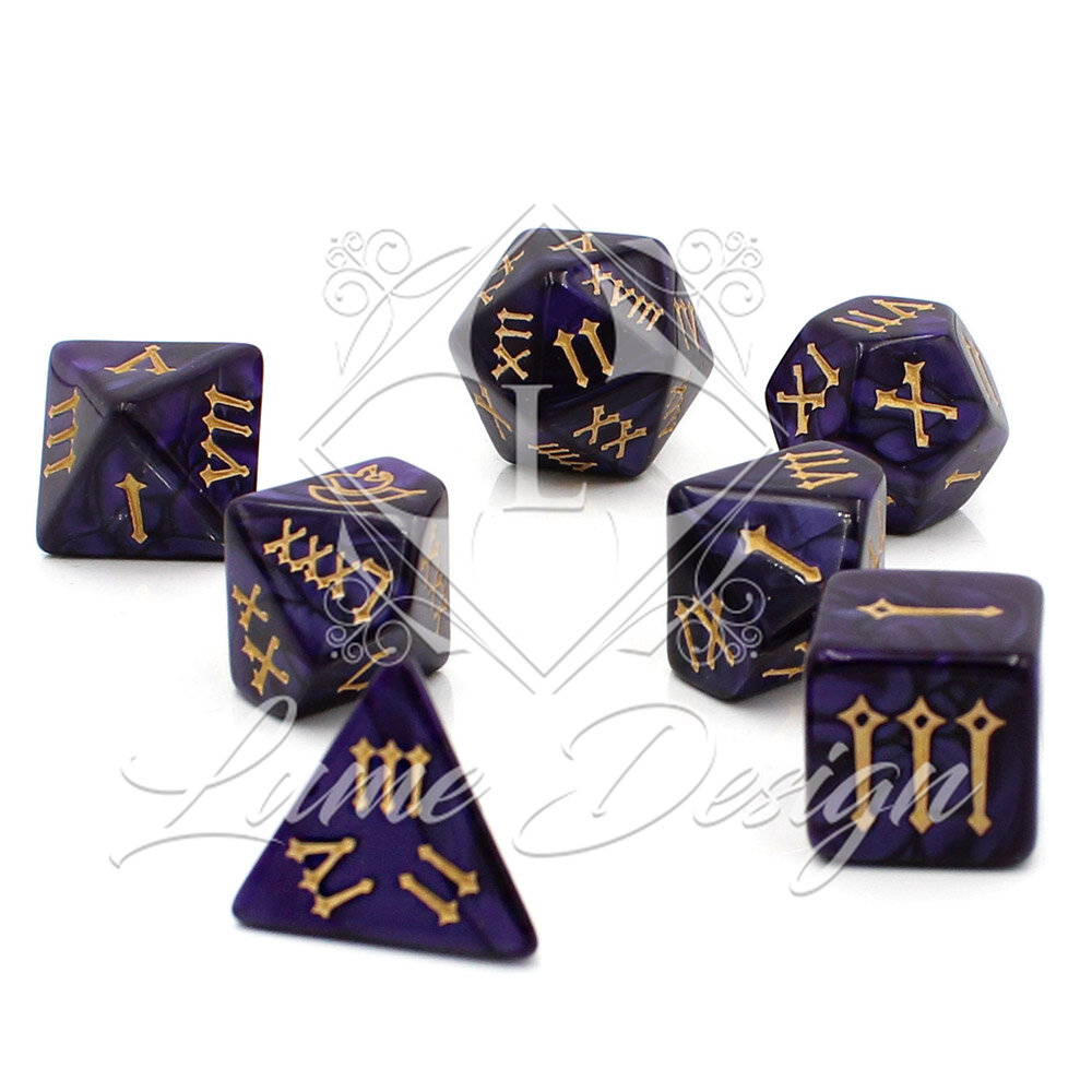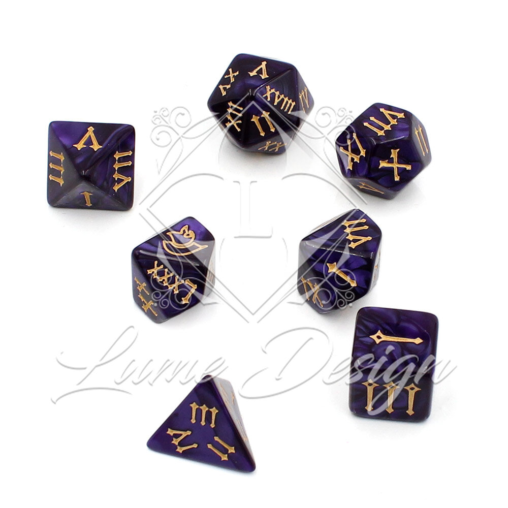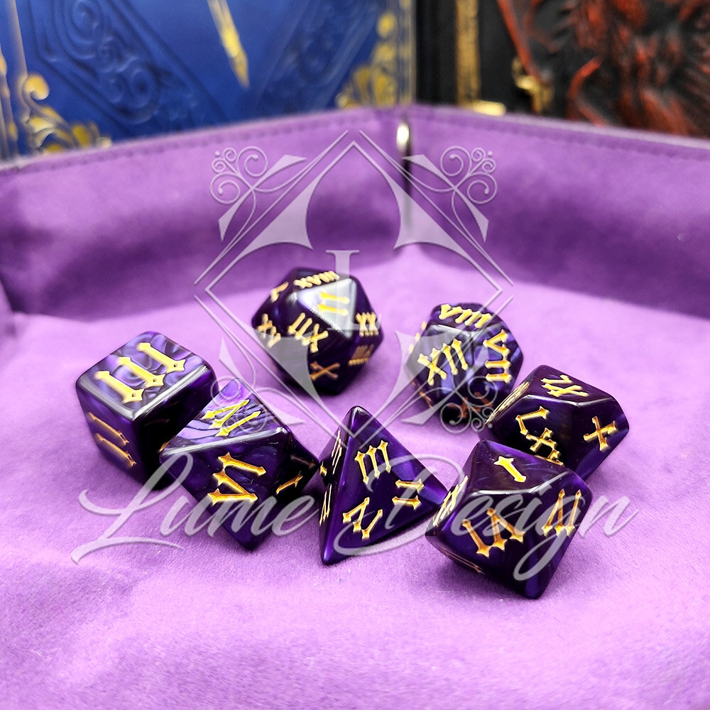 Kości RPG Cyfry Rzymskie Fioletowe Złote Zestaw DnD