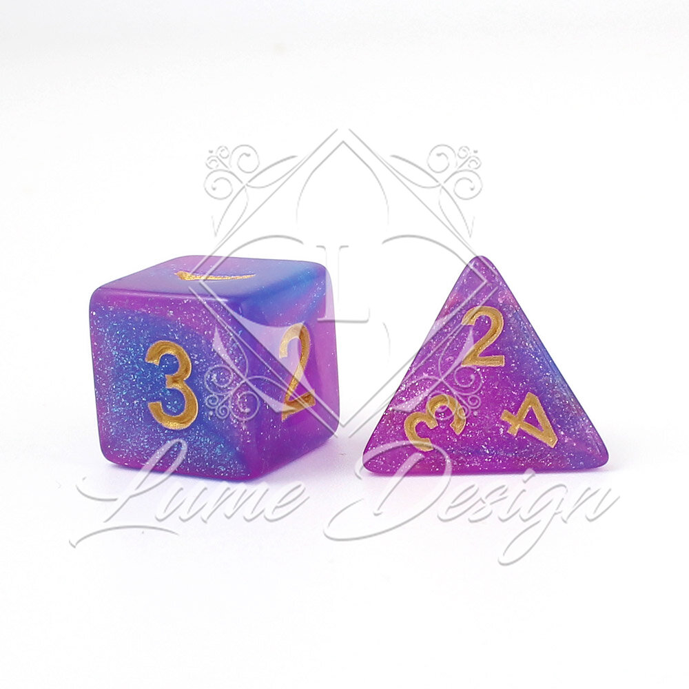 Zestaw "Astro Dust" czerpie inspirację z nieskończoności kosmosu i międzywymiarowych podróży. Przenikające się barwy indygo i purpury tworzą efekt mgławicy, a zatopione w nich błyszczące drobinki brokatu przypominają gwiezdny pył zawieszony w próżni. Całość dopełniają eleganckie, złote cyfry, które lśnią niczym słońca na tle nocnego nieba. To kości o niezwykle eterycznym, wręcz onirycznym klimacie, idealne dla tych, którzy w swoich przygodach sięgają gwiazd.