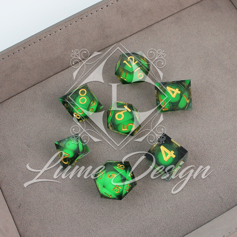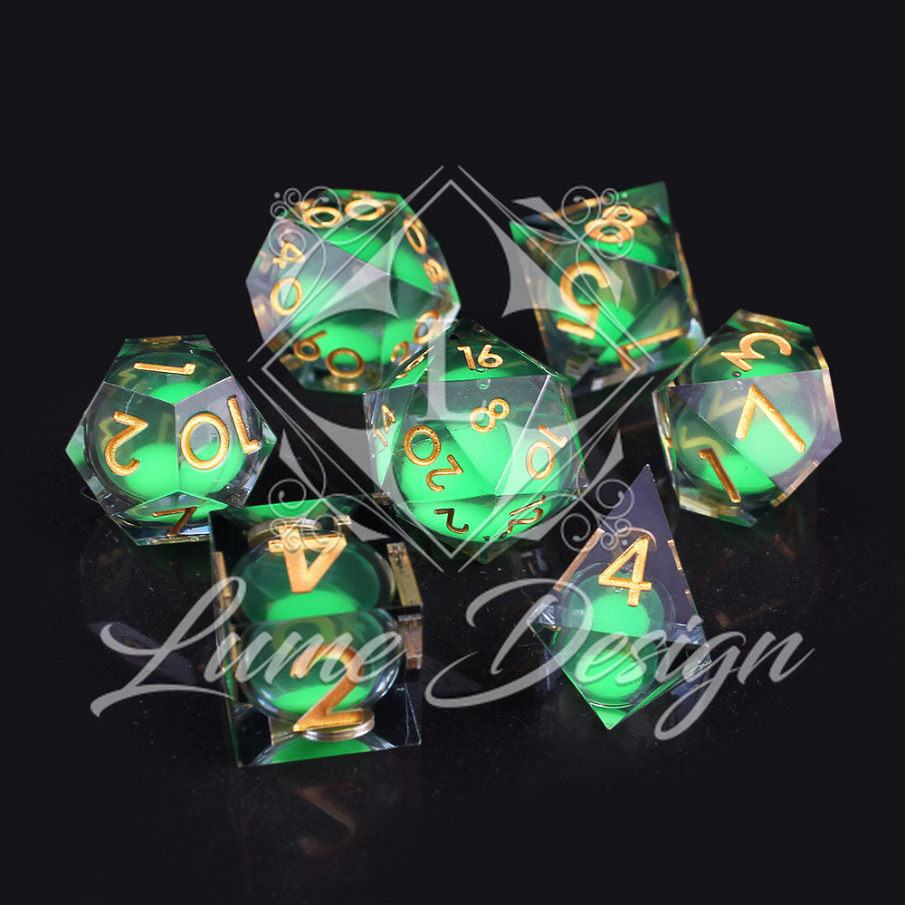 Efekt: Liquid Core – w sercu każdej kostki znajduje się płynna sfera wypełniona intensywnie zielonym, drobnoziarnistym piaskiem. Podczas rzutu piasek wiruje i przesypuje się, tworząc hipnotyzujący efekt "żywej energii".
