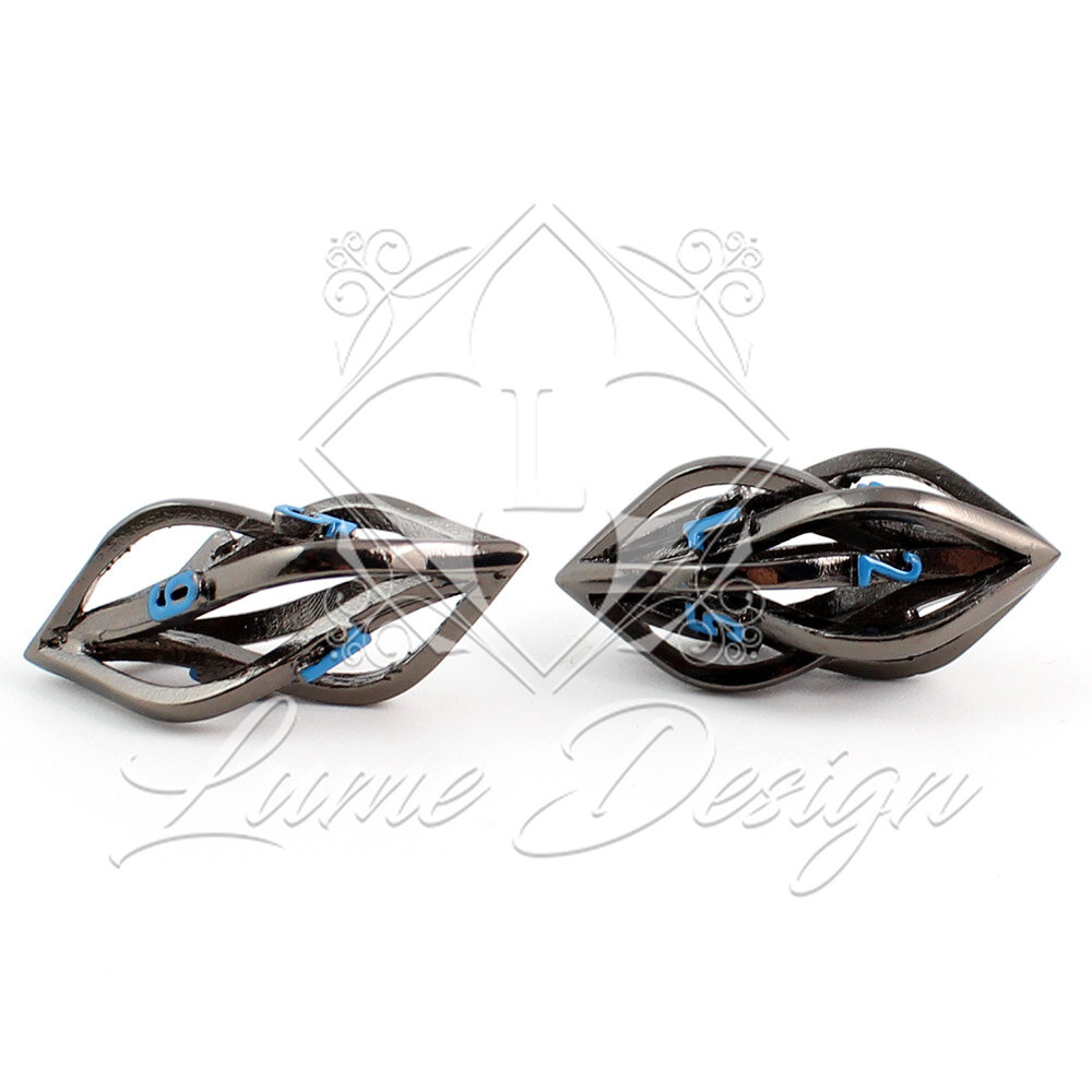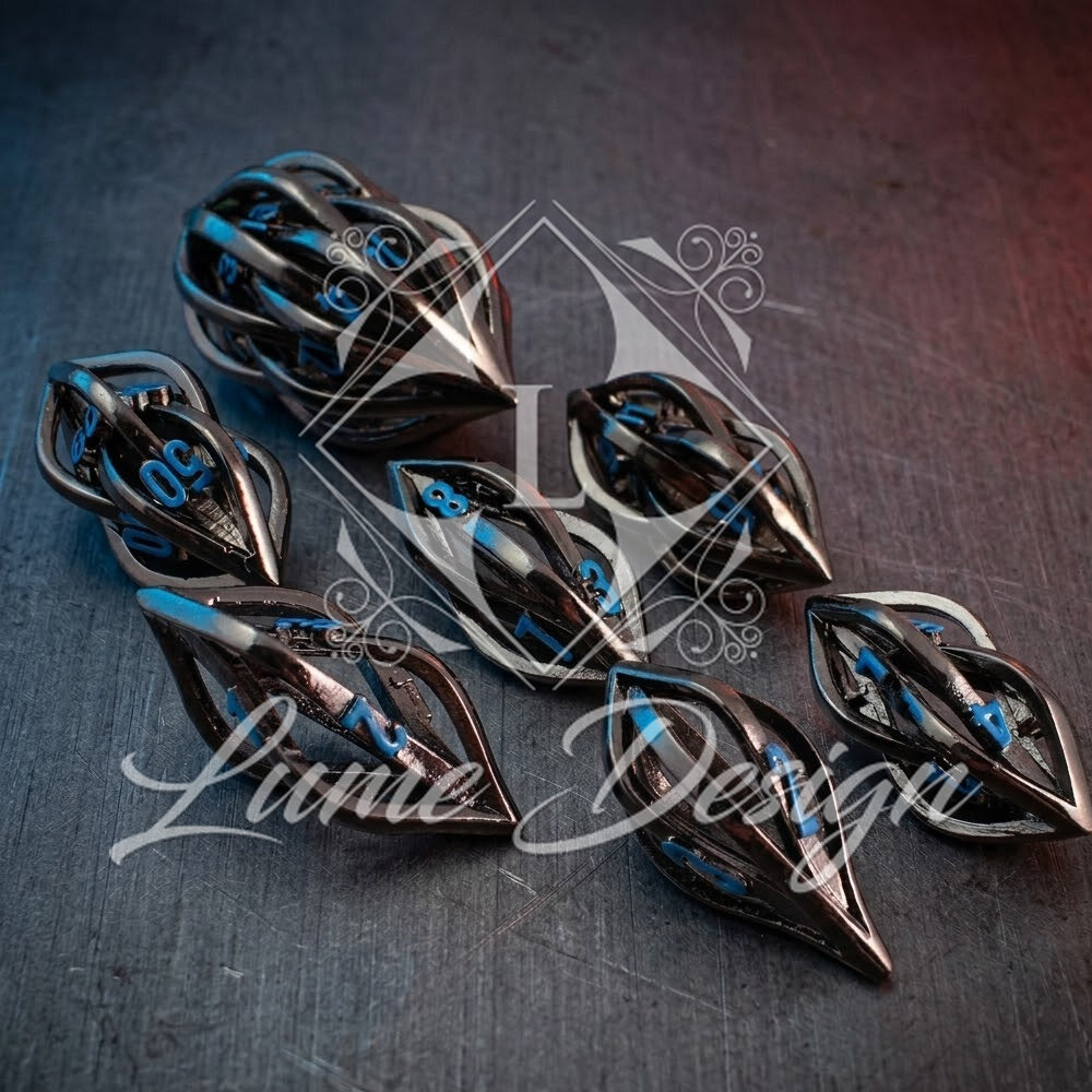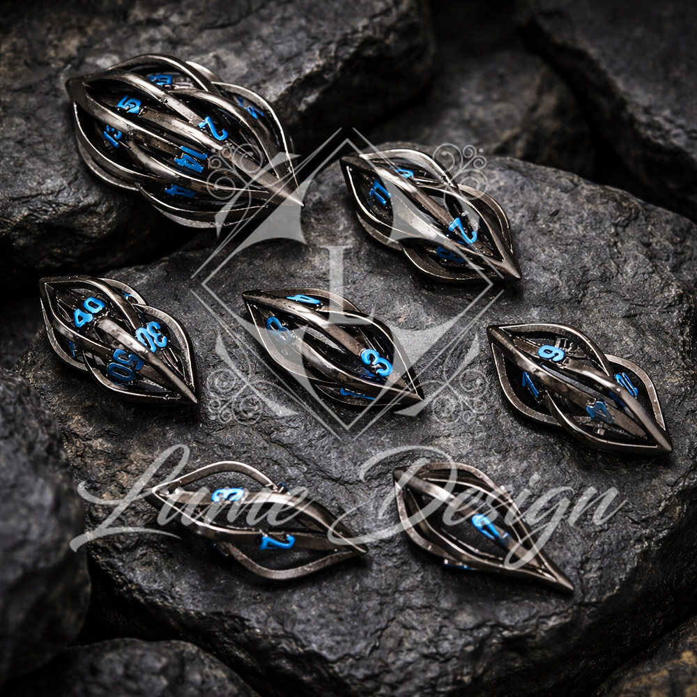 Unikatowe ażurowe kości RPG w kolorze czarnym z niebieskimi cyframi o nowoczesnym kształcie | Kości Metalowe Neon Weave Lume Design