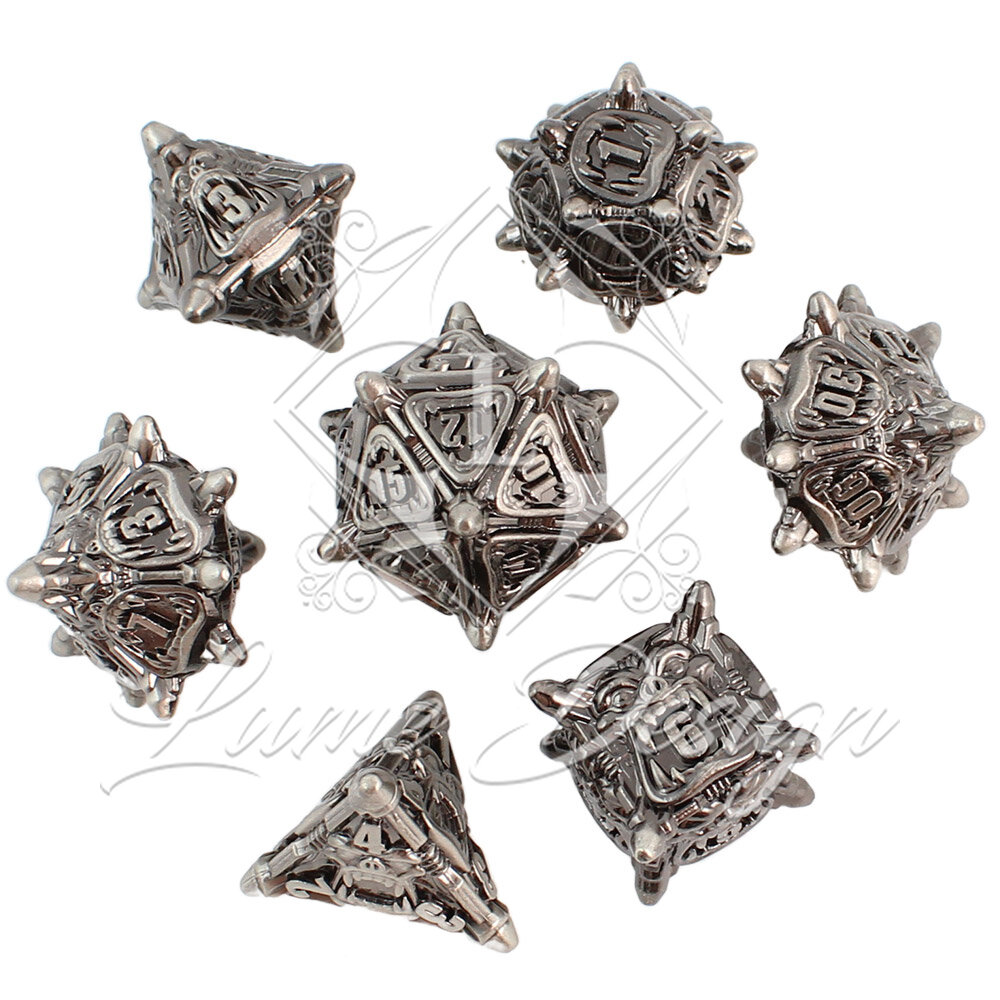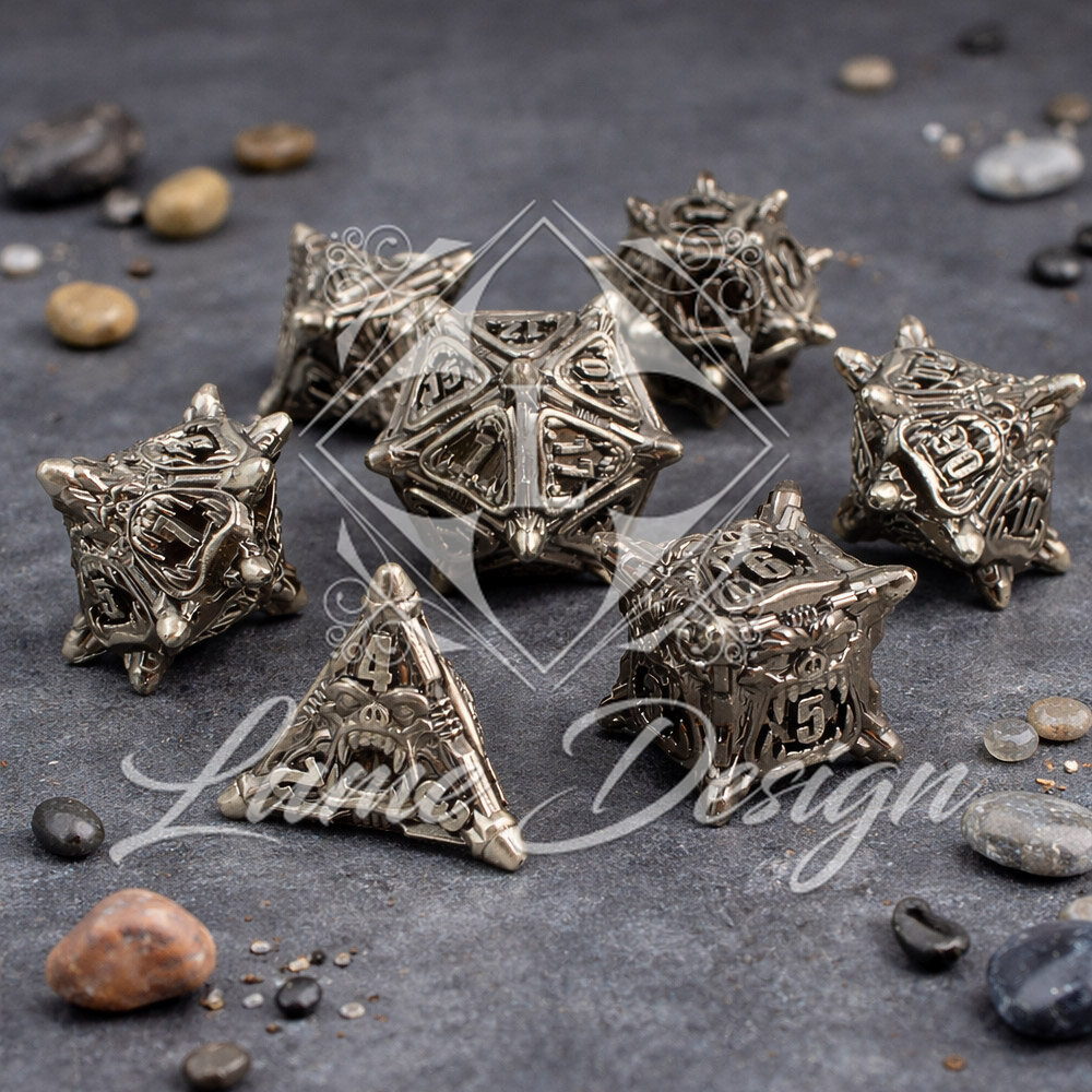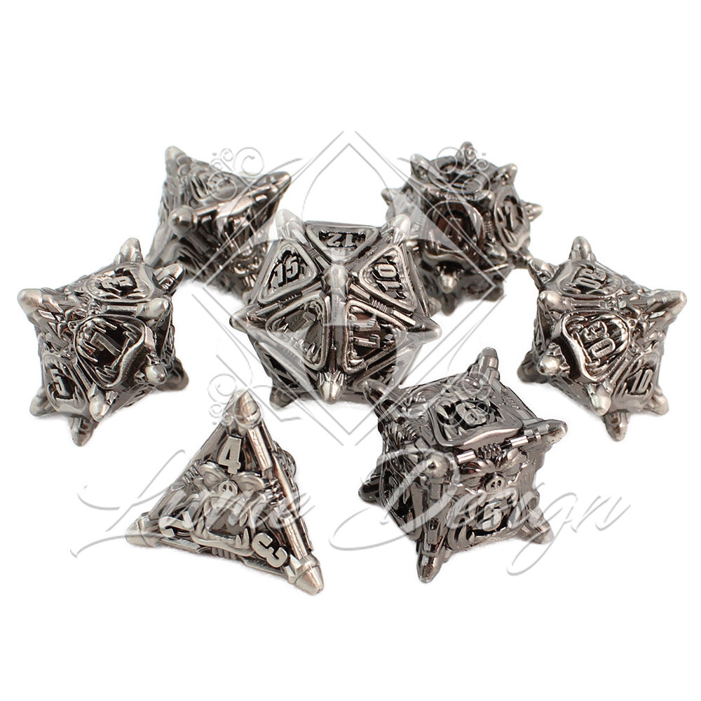 Zestaw 7 metalowych kości wielościennych do gier fabularnych RPG.