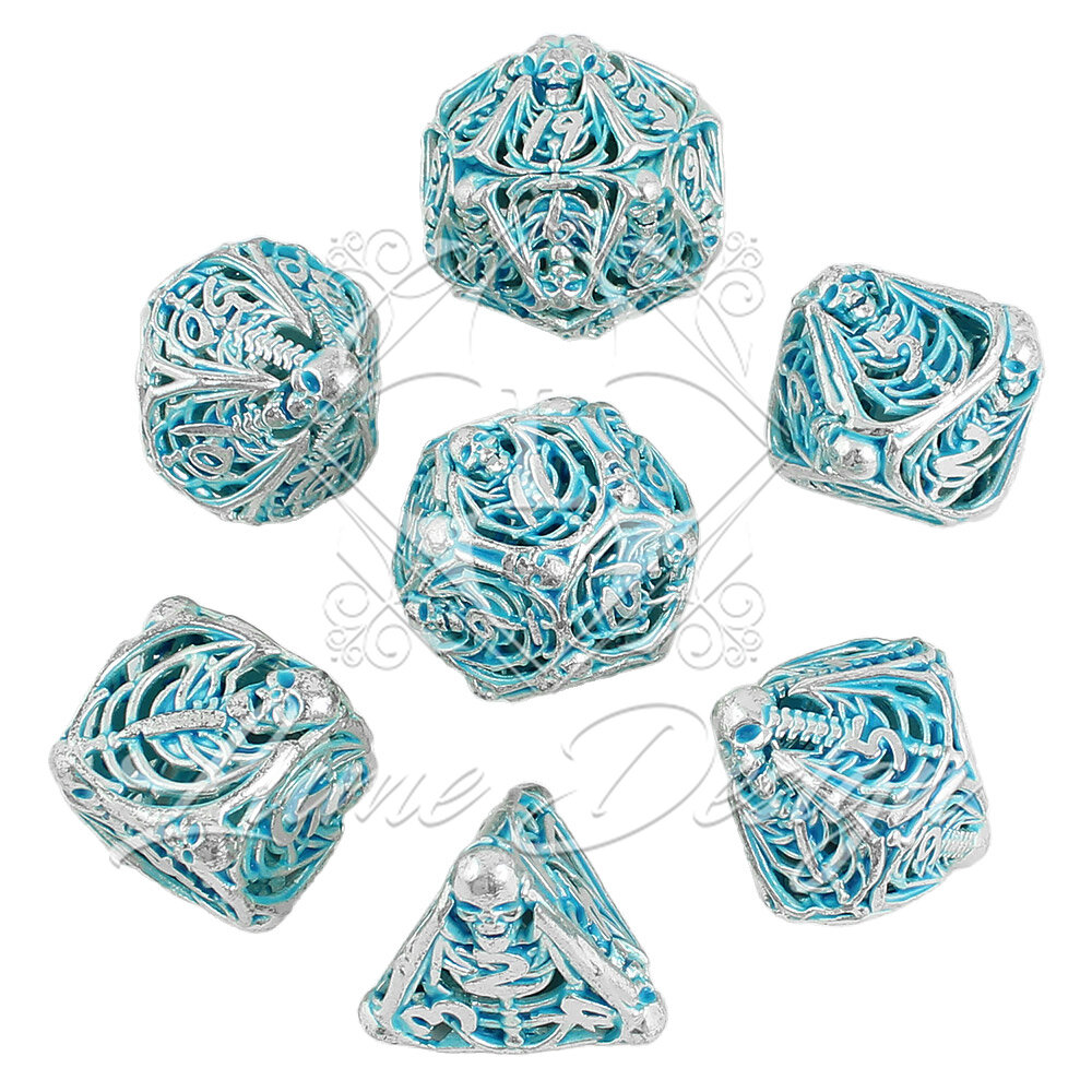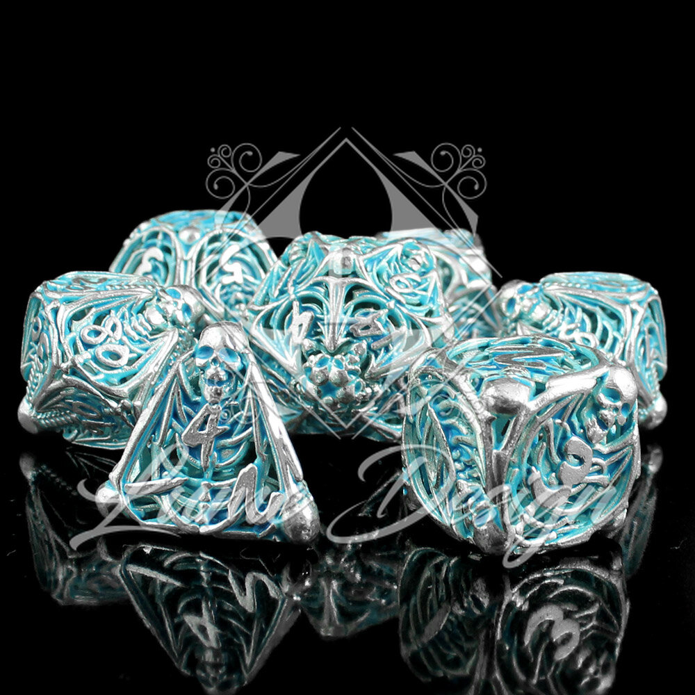 Metalowe ażurowe kości RPG ze szkieletami świecące na błękitno w ciemności | Kości RPG Frostbound Souls Lume Design