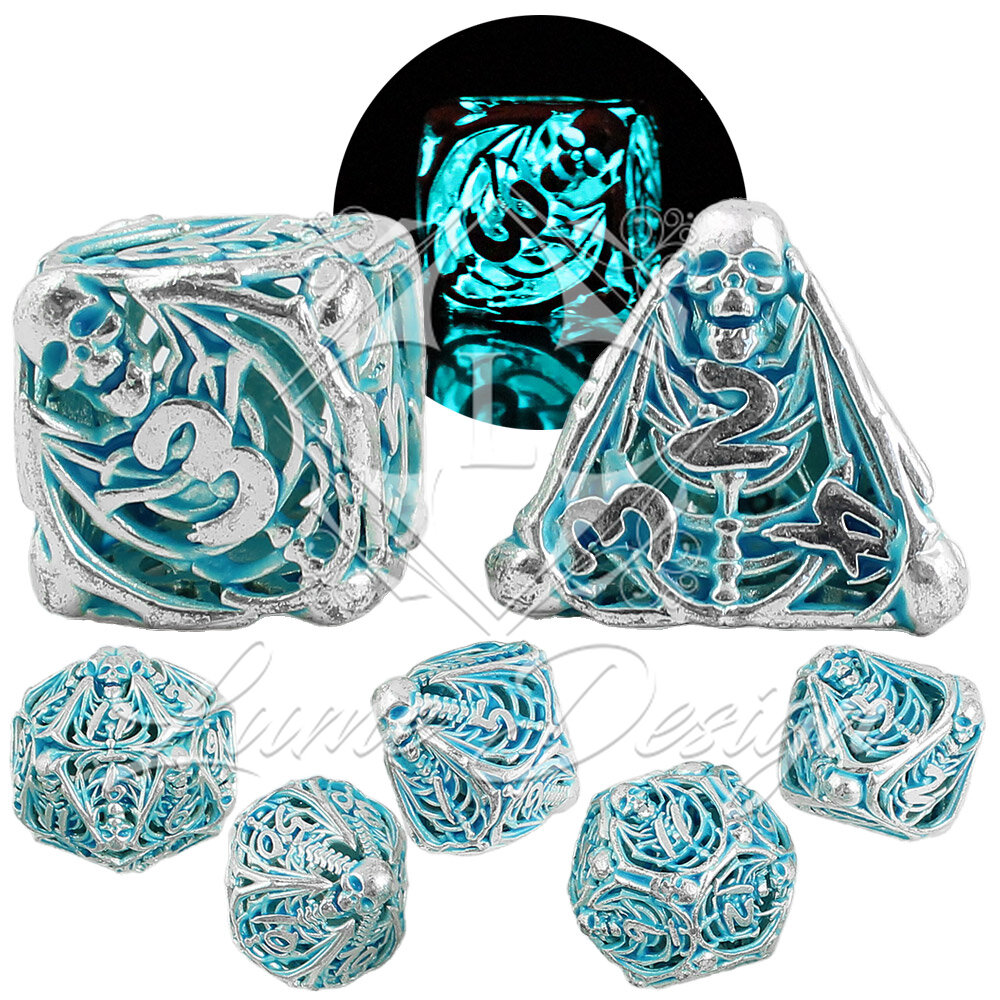 Kości RPG Metalowe Świecą w Ciemności Czaszki DnD Zestaw Szkielety Prezent