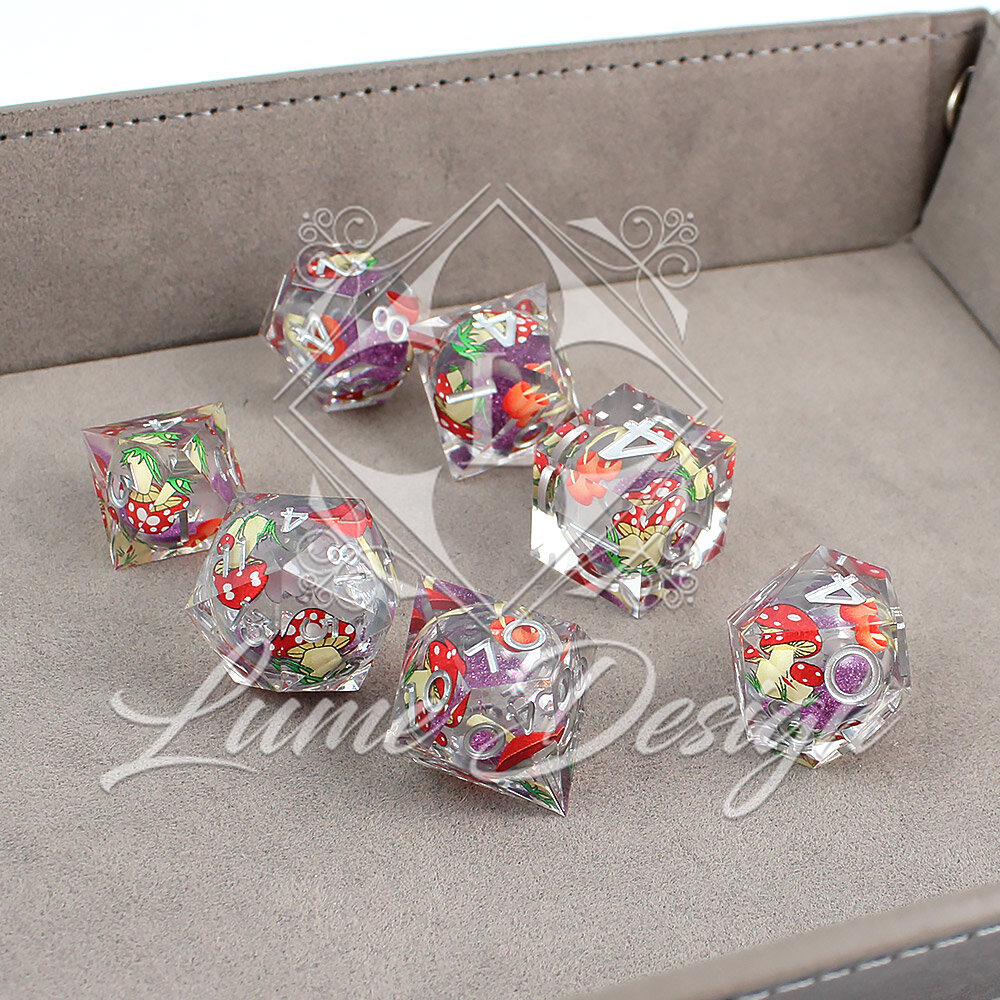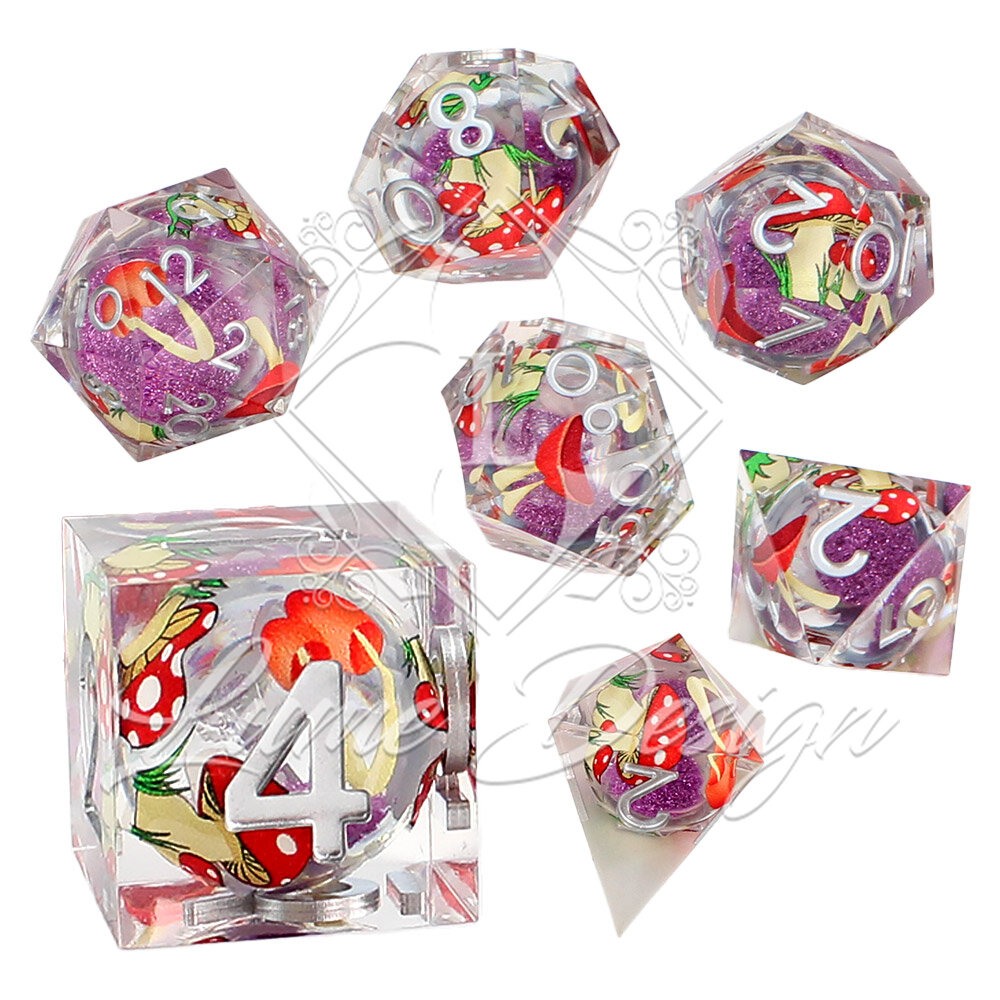Kości RPG Płynne Grzyby Muchomory Fiolet Zestaw Prezent Grzybki dnd