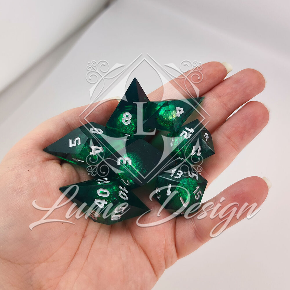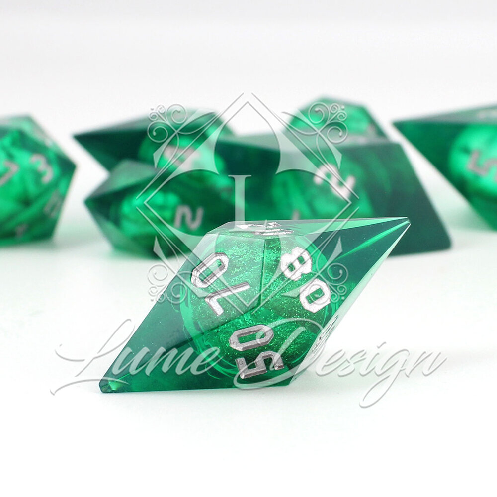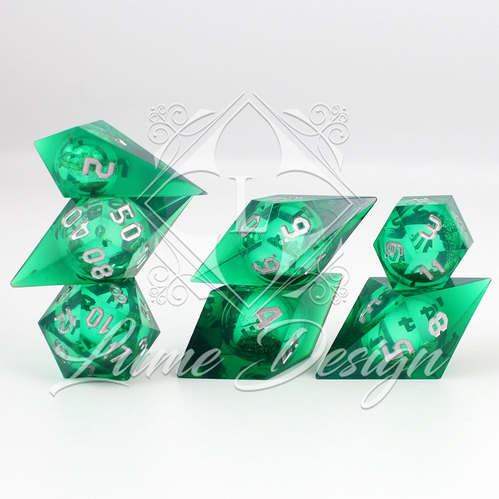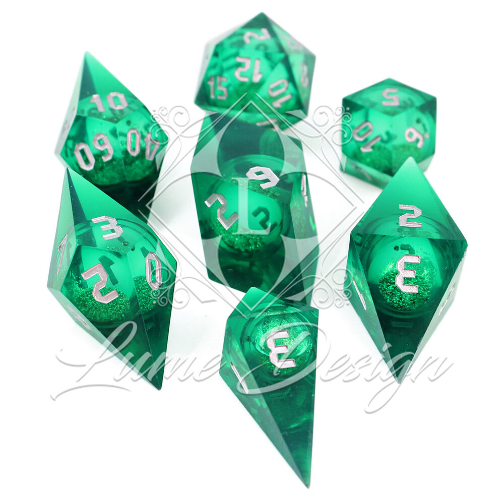 Kości RPG Płynny Środek Kryształy Zielone Ostre DnD Zestaw Kostki