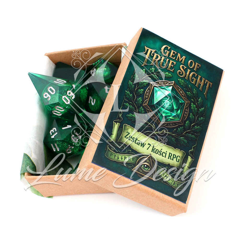 Gem of True Sight to zestaw, który wydaje się pochodzić z innego planu egzystencji. Ich nietypowe kształty przypominają naturalne formacje kryształów, a wirujący w środku pyłek to "prawdziwe widzenie", które pozwala dostrzec to, co ukryte przed zwykłym wzrokiem. Idealne dla postaci poszukujących prawdy, badaczy tajemnic i tych, którzy chcą, by ich akcesoria wyróżniały się na tle klasycznych kostek.