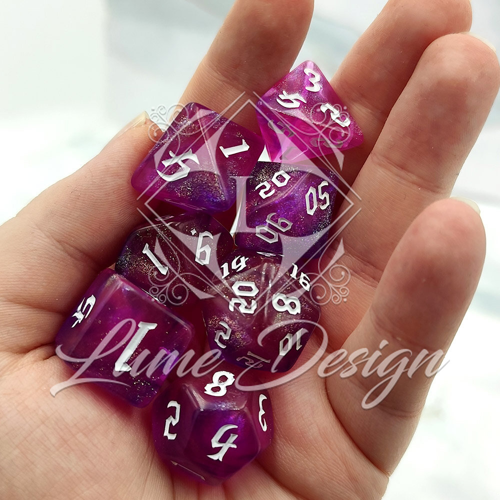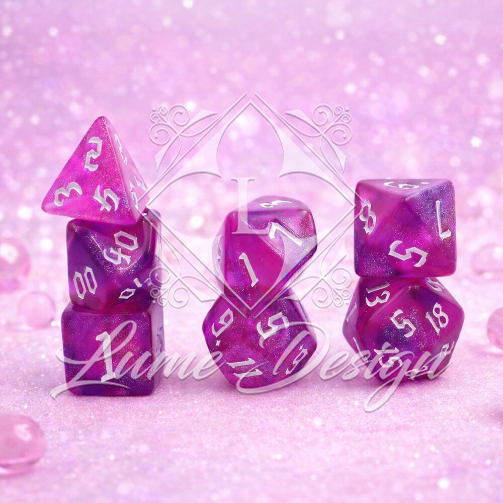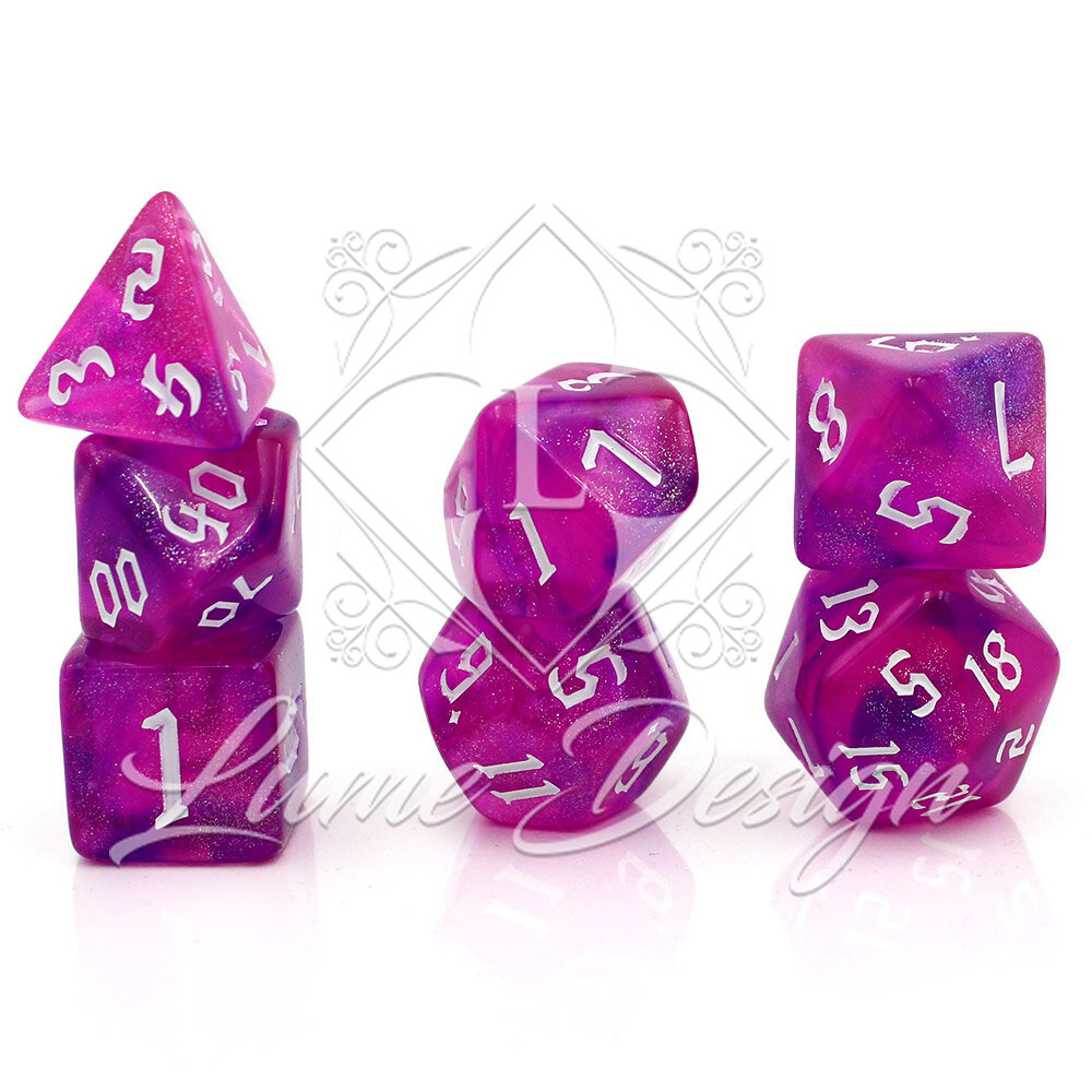 Zestaw ten tętni magiczną energią. To barwy Dzikiej Magii, zaklęć iluzji i eliksirów miłosnych. Brokatowy pył zatopiony w różowo-fioletowym tworzywie przywodzi na myśl wróżkowy pył z krainy Feywild. Kości te idealnie pasują do postaci barwnych, chaotycznych i pełnych życia.