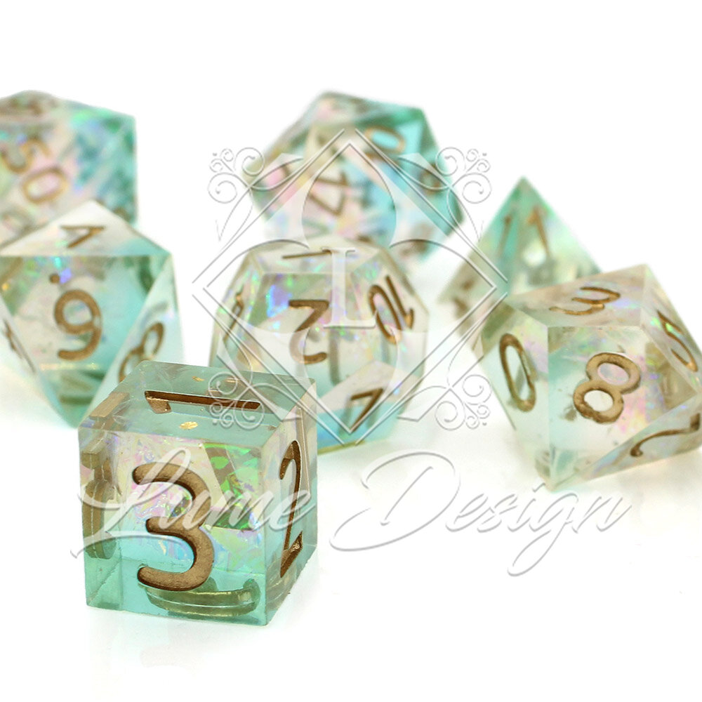 Aurora Mint to esencja światła i magii powietrza. Przywodzą na myśl pałac Królowej Śniegu, magiczne zwierciadła lub skarby z krainy Feywild. Są delikatne i eteryczne, a jednocześnie ostre i wyraziste. To kości, które przyciągają wzrok na stole, błyszcząc niczym biżuteria.