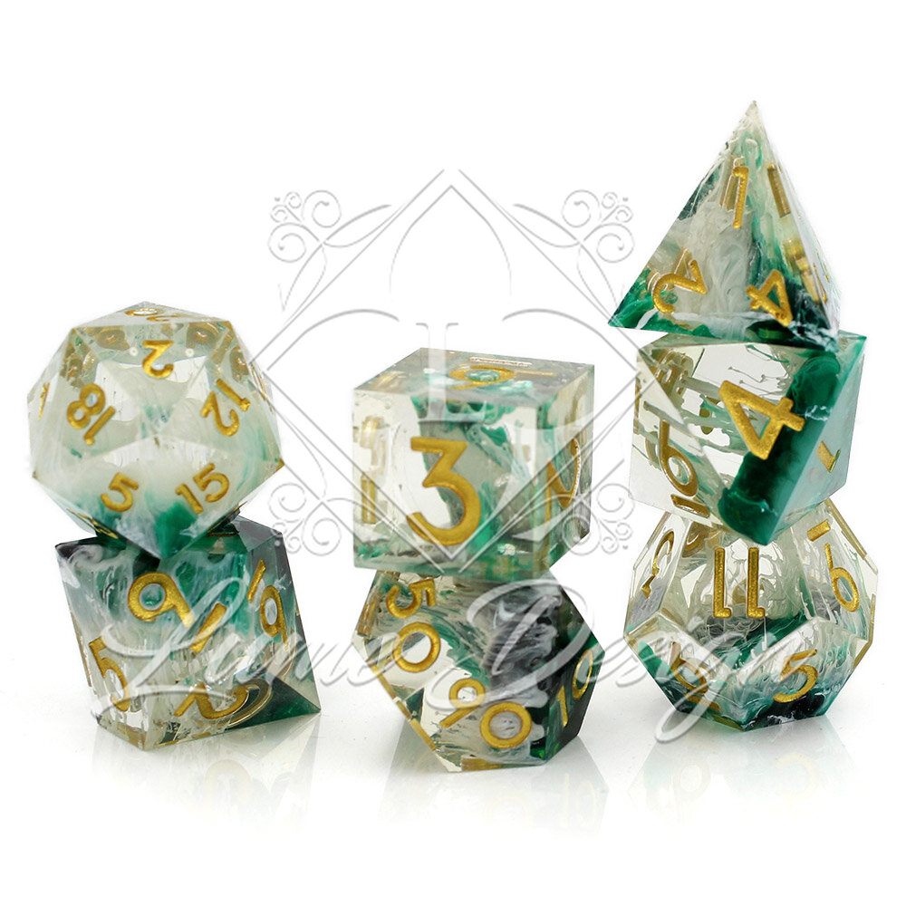 Kości RPG Sharp Edge Żywica Zielone Złote Zestaw DnD