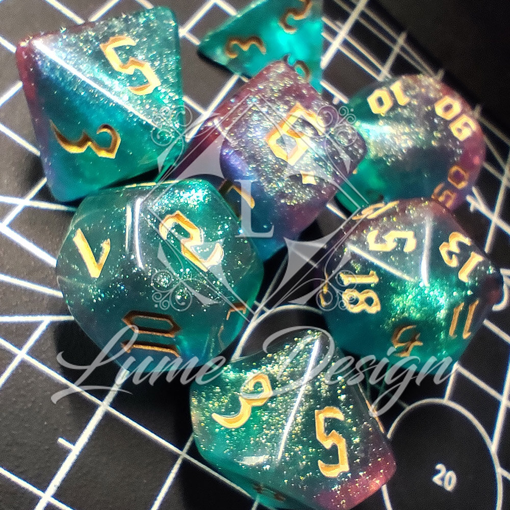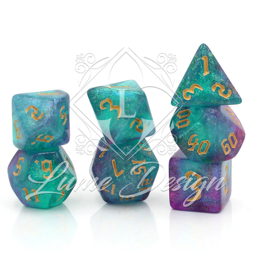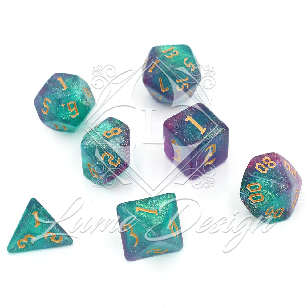 Zestaw kości RPG Aurora Dreams turkusowo-fioletowe z brokatem