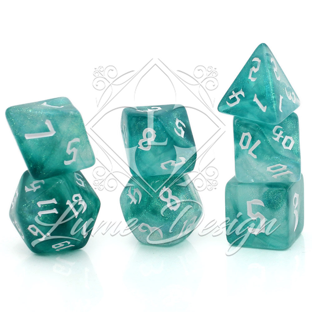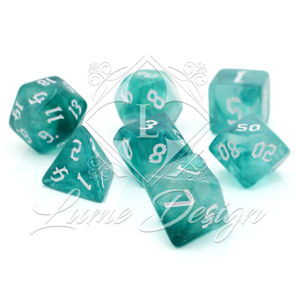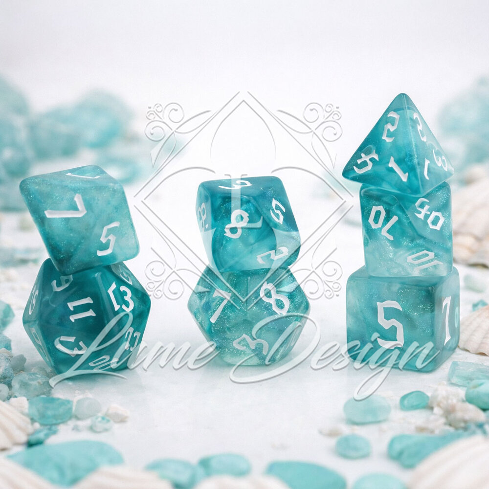 Kości te przywodzą na myśl skarby zatopione w lagunie lub magiczny wir na środku oceanu. Kolor balansuje między spokojnym błękitem a drapieżnym cyjanem, a brokat dodaje im magicznego, "mokrego" połysku. Idealny wybór dla Kapłana Domeny Burzy, Wodnego Genasi, żeglarza czy pirata szukającego przygód na Morzu Mieczy.