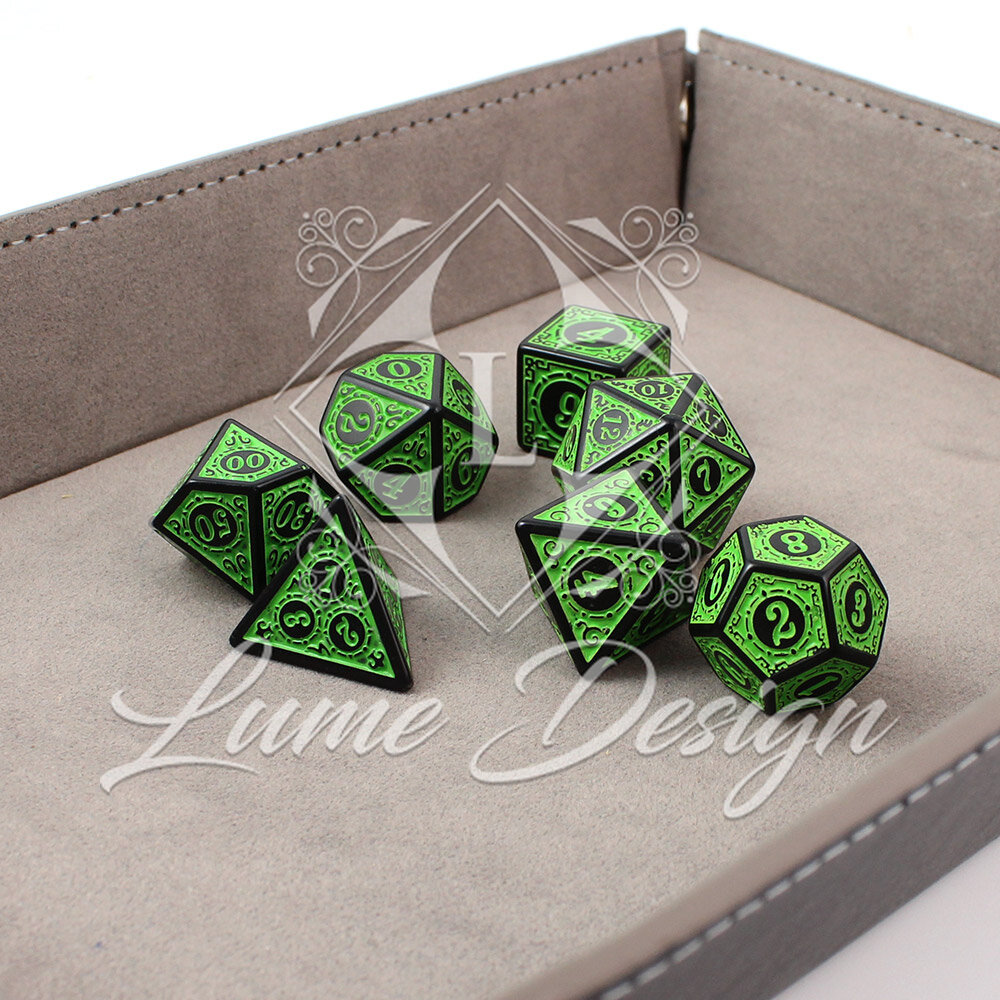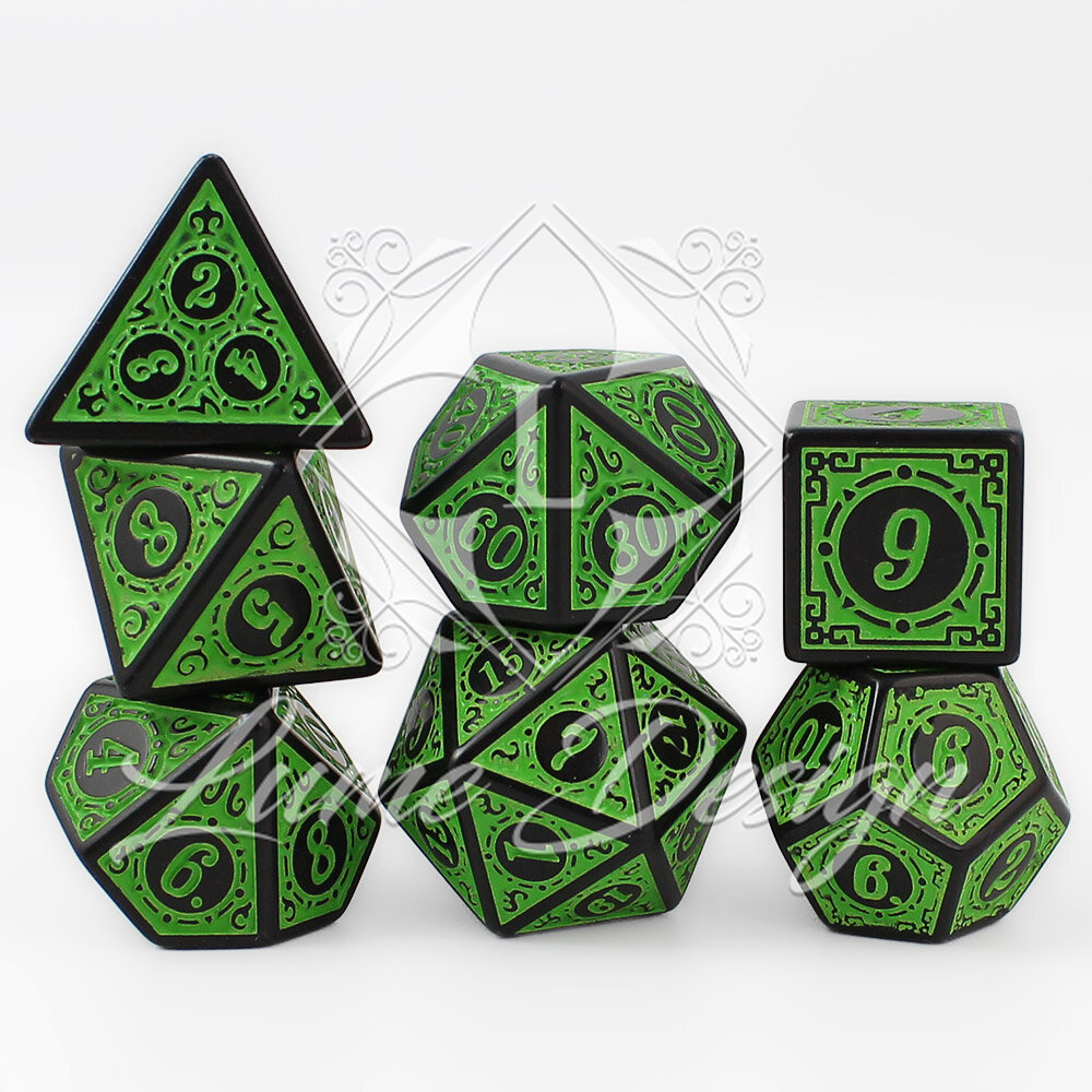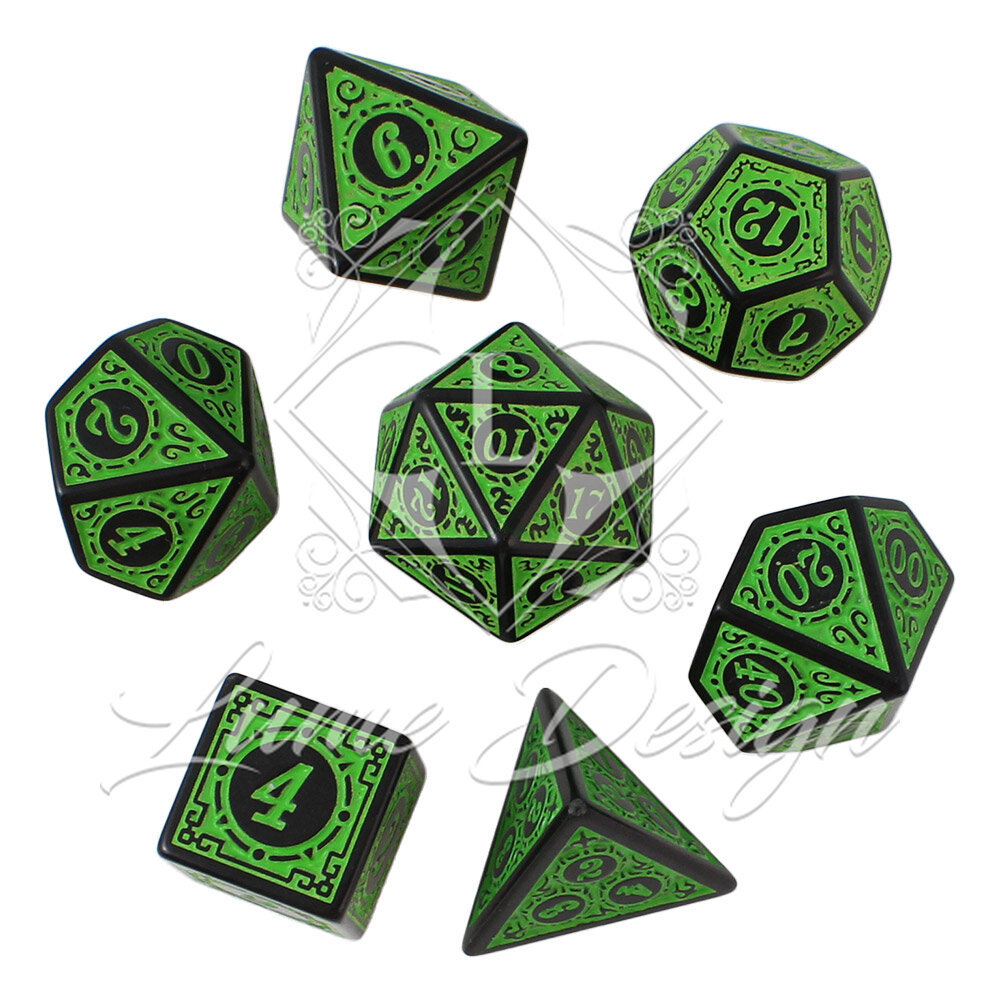 Sięgnij po zakazaną wiedzę z zestawem "Verdant Arcane". Te kości to połączenie mroku nocy z jadowitą, magiczną zielenią, która zdaje się pulsować energią wprost z zapomnianych grimuarów.