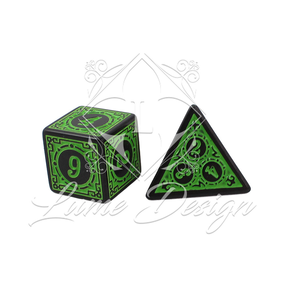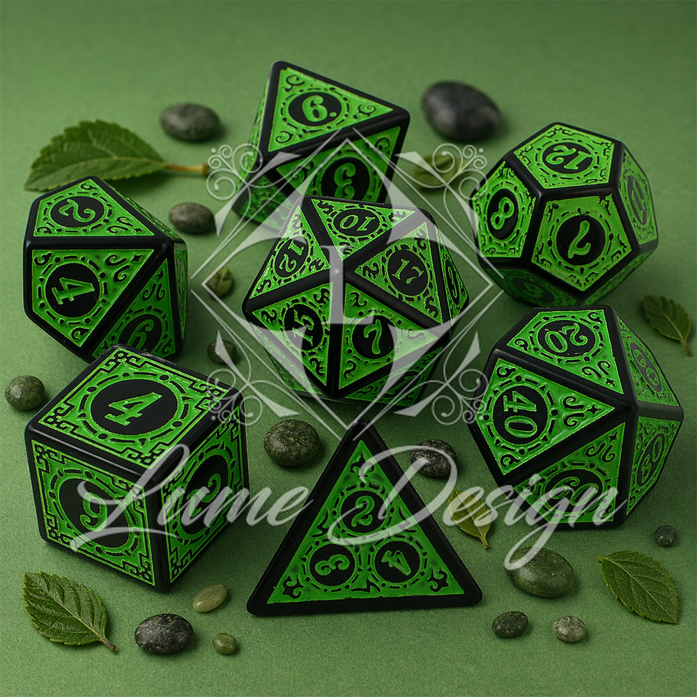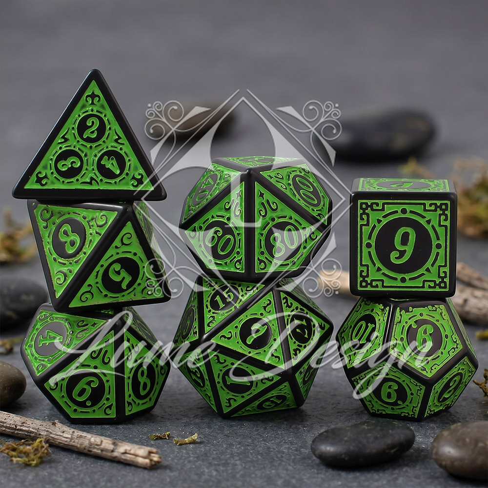 Zestaw "Verdant Arcane" przywodzi na myśl starożytne artefakty odnalezione w ruinach porośniętych mchem świątyń lub w pracowniach czarnoksiężników eksperymentujących z magią natury. Każda ścianka została ujęta w misterne, ozdobne ramki o geometrycznym charakterze, co nadaje im rzemieślniczego, wręcz rytualnego wyglądu. Kontrast między głęboką czernią materiału a jaskrawą zielenią detali sprawia, że rzuty są nie tylko czytelne, ale i niezwykle efektowne. To kości dla tych, których magia jest równie potężna, co niebezpieczna.
