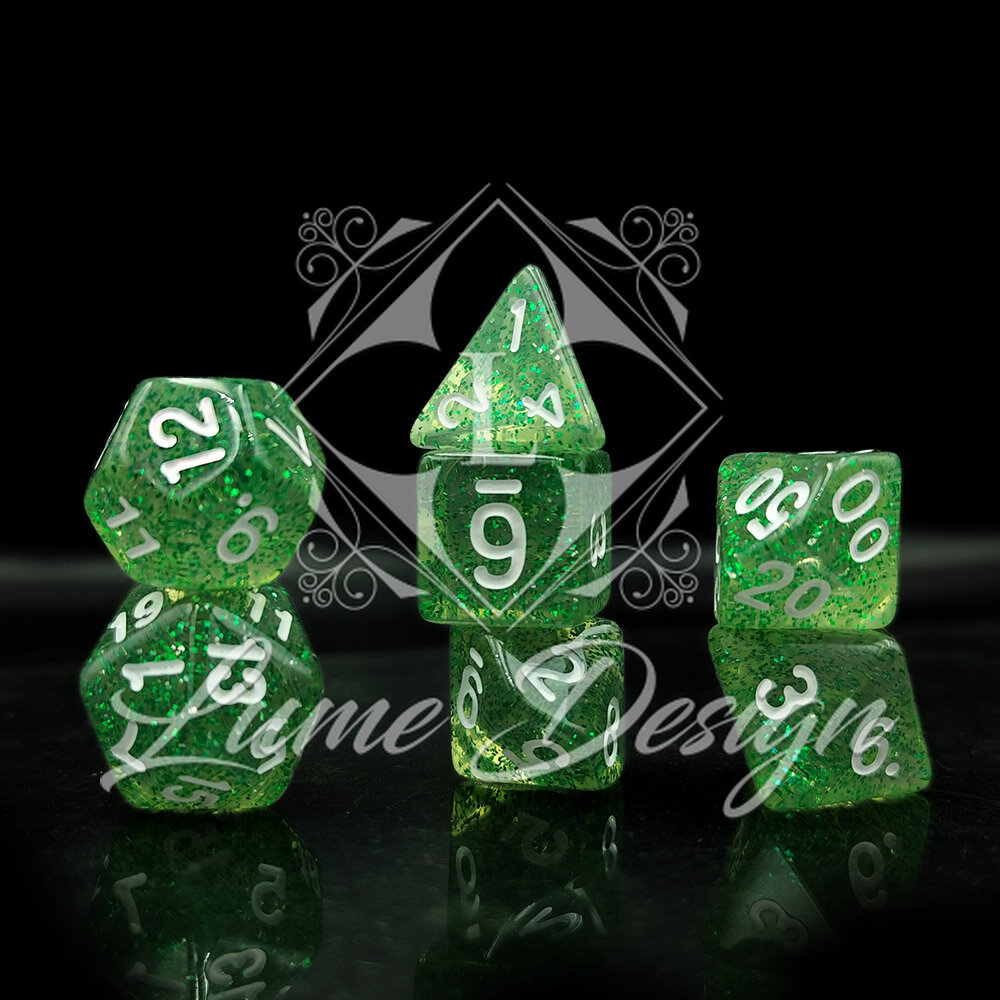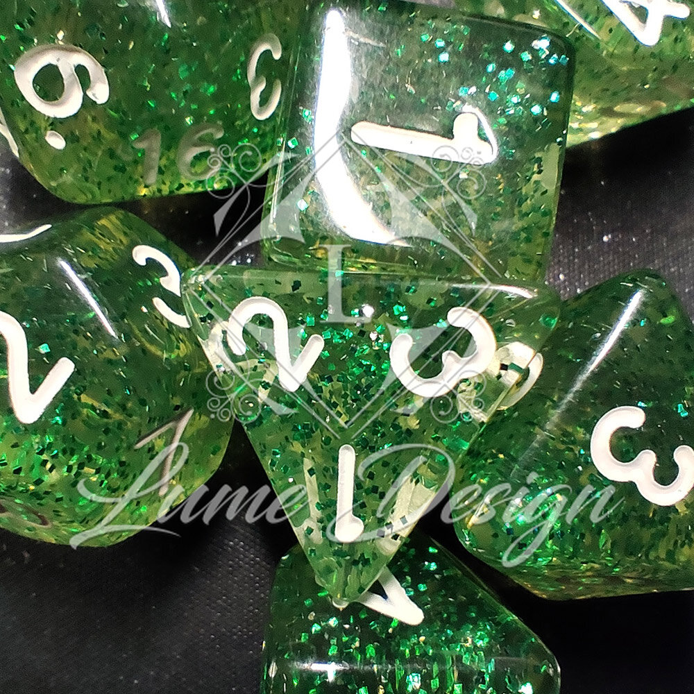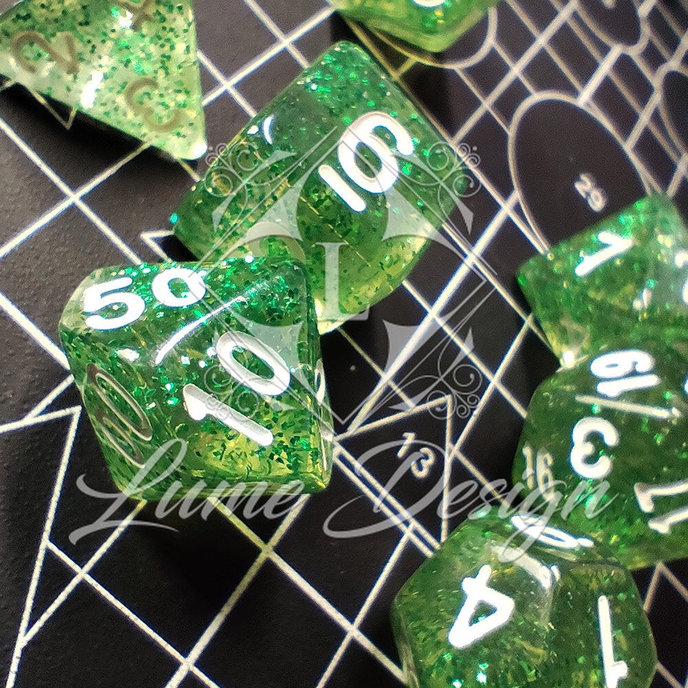 Kości RPG Zielone Brokatowe Zestaw DnD Akryl Transparentne
