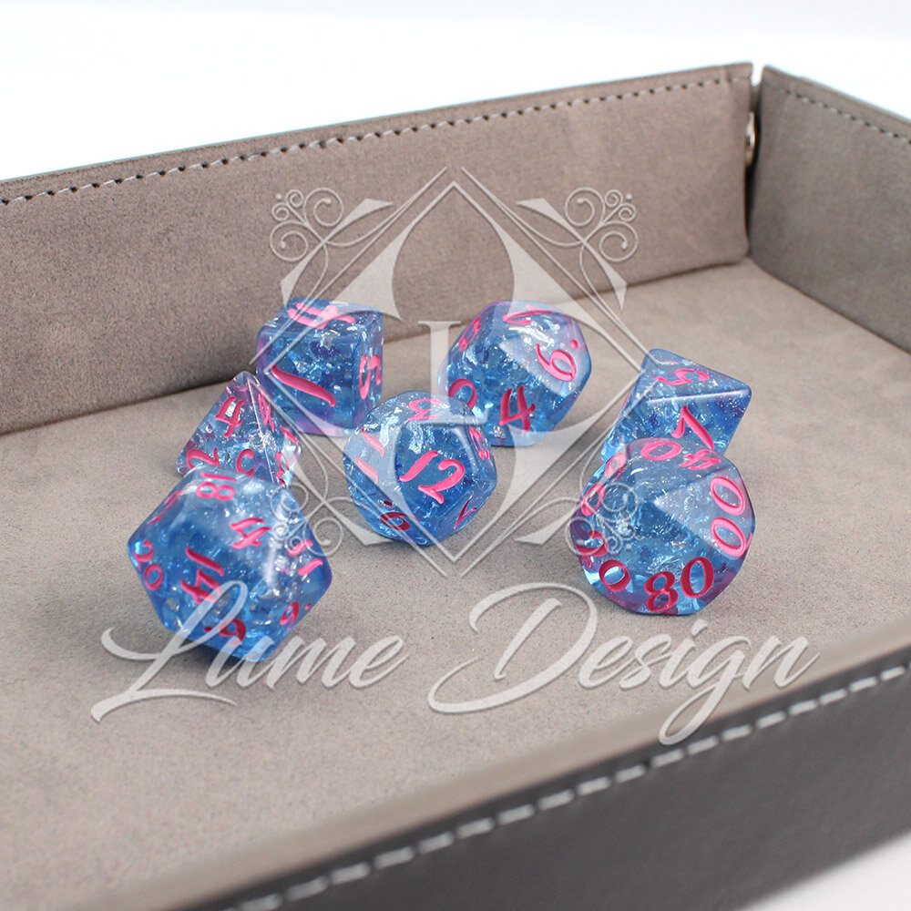 Wyobraź sobie krystaliczną, lodową jaskinię na dalekiej północy, w której nagle zaczynają odbijać się różowe światła polarnej zorzy. Srebrne drobinki zatopione w chłodnym błękicie przywodzą na myśl zamarznięty w bryle lodu gwiezdny pył. Zestaw Frozen Aurora niesie ze sobą rześki, zimowy klimat, połączony z radosnym, neonowym akcentem, który doskonale ożywi każdy stół RPG.
