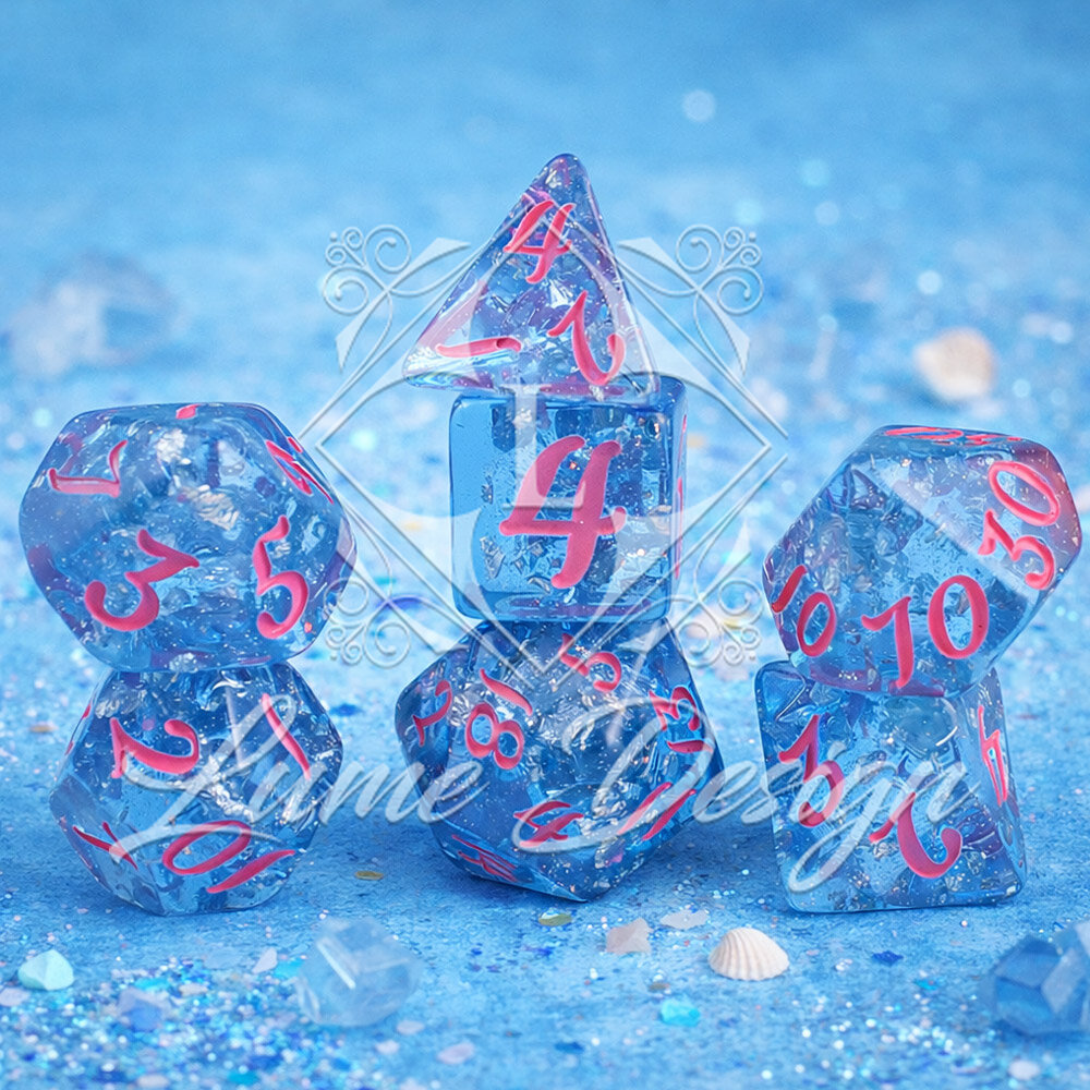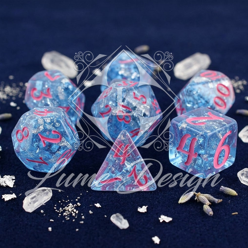 Klimatyczny zestaw 7 kości wielościennych do gier fabularnych RPG o lodowym charakterze.