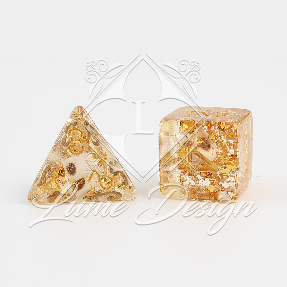 Wewnątrz tych kości fabrycznie zatopione są miniaturowe czaszki. Niestety, ze względu na specyfikę odlewu, żywicę i nagromadzenie złotych drobinek, czaszki te są niemal całkowicie niewidoczne (trzeba się im bardzo mocno przyjrzeć pod światło). Ten wizualny mankament absolutnie nie wpływa na wyważenie ani komfort gry, ale z jego powodu zestaw oferowany jest w znacznie obniżonej, bardzo atrakcyjnej cenie.