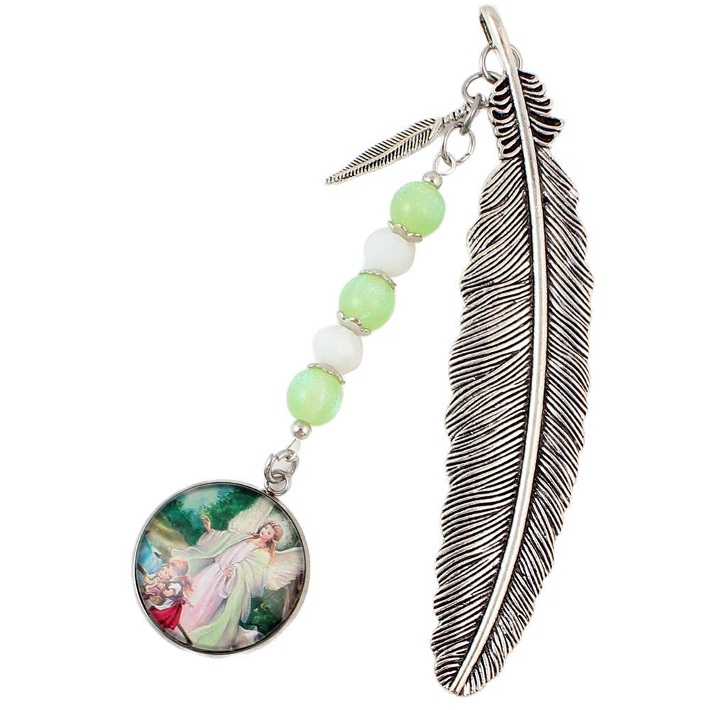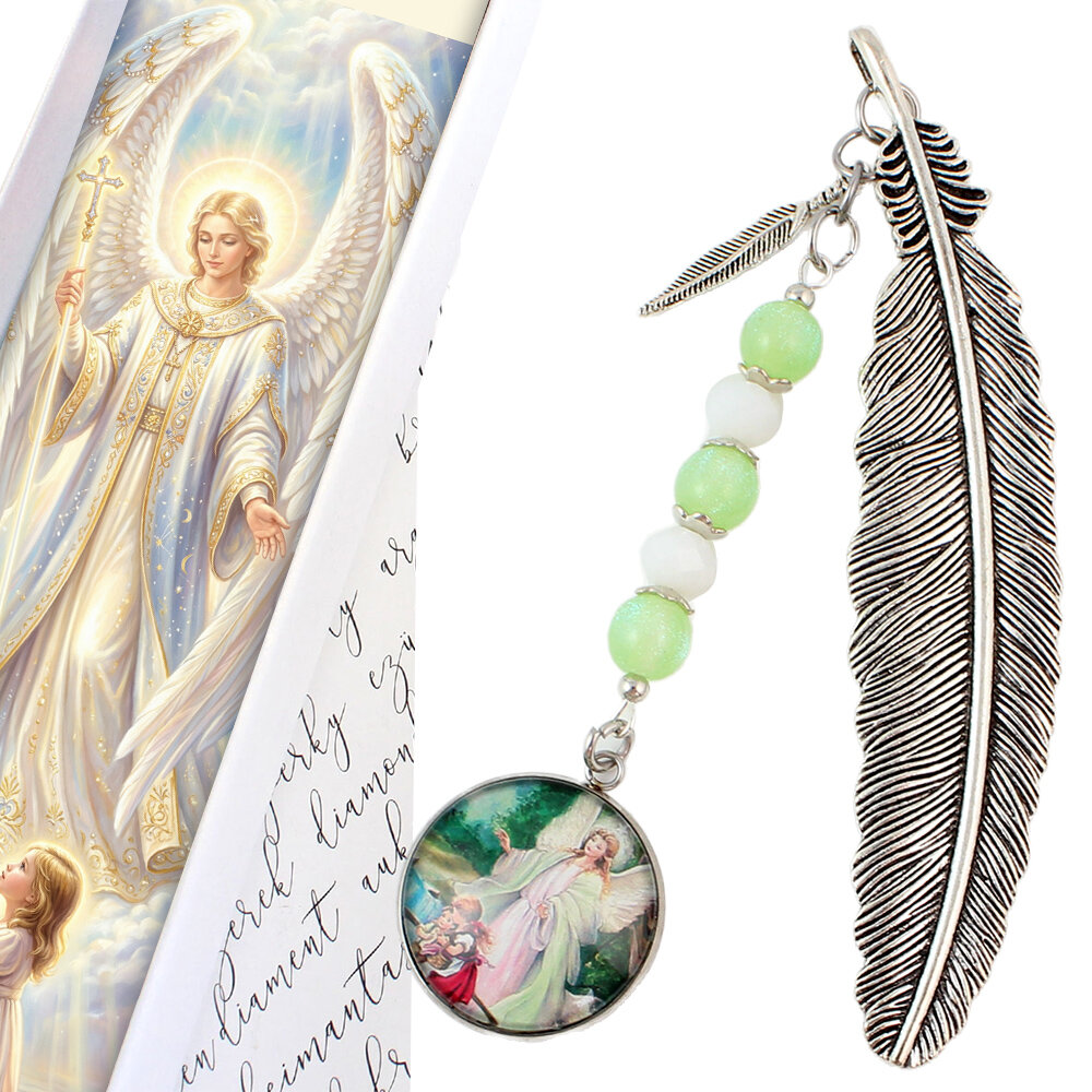 Ręcznie robiona zakładka do książki Anioł Stróż z ilustracją opiekuńczej postaci pod szklanym kaboszonem i subtelnymi koralikami.