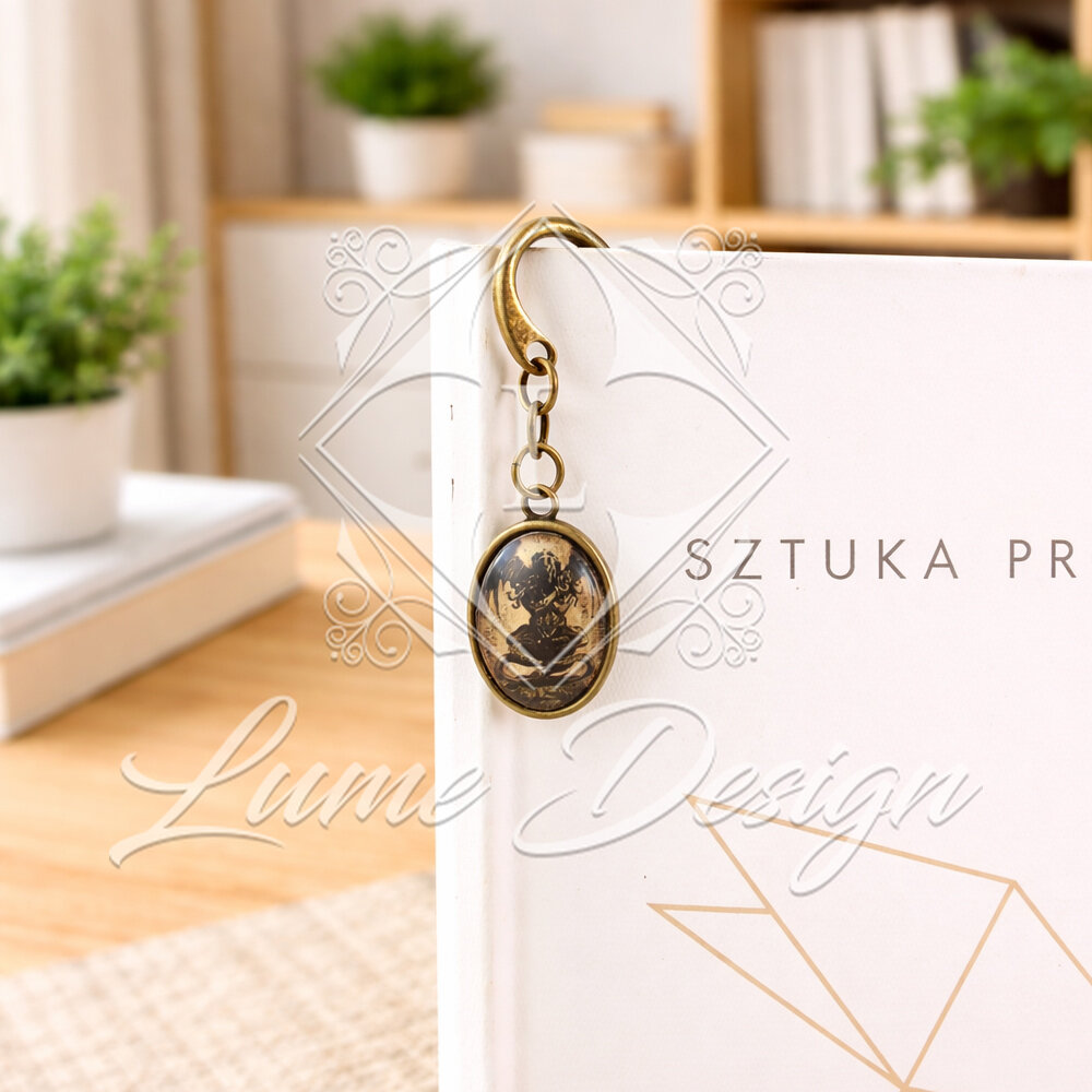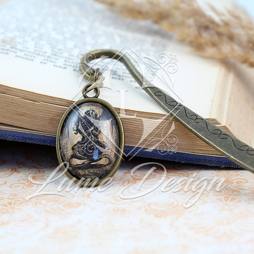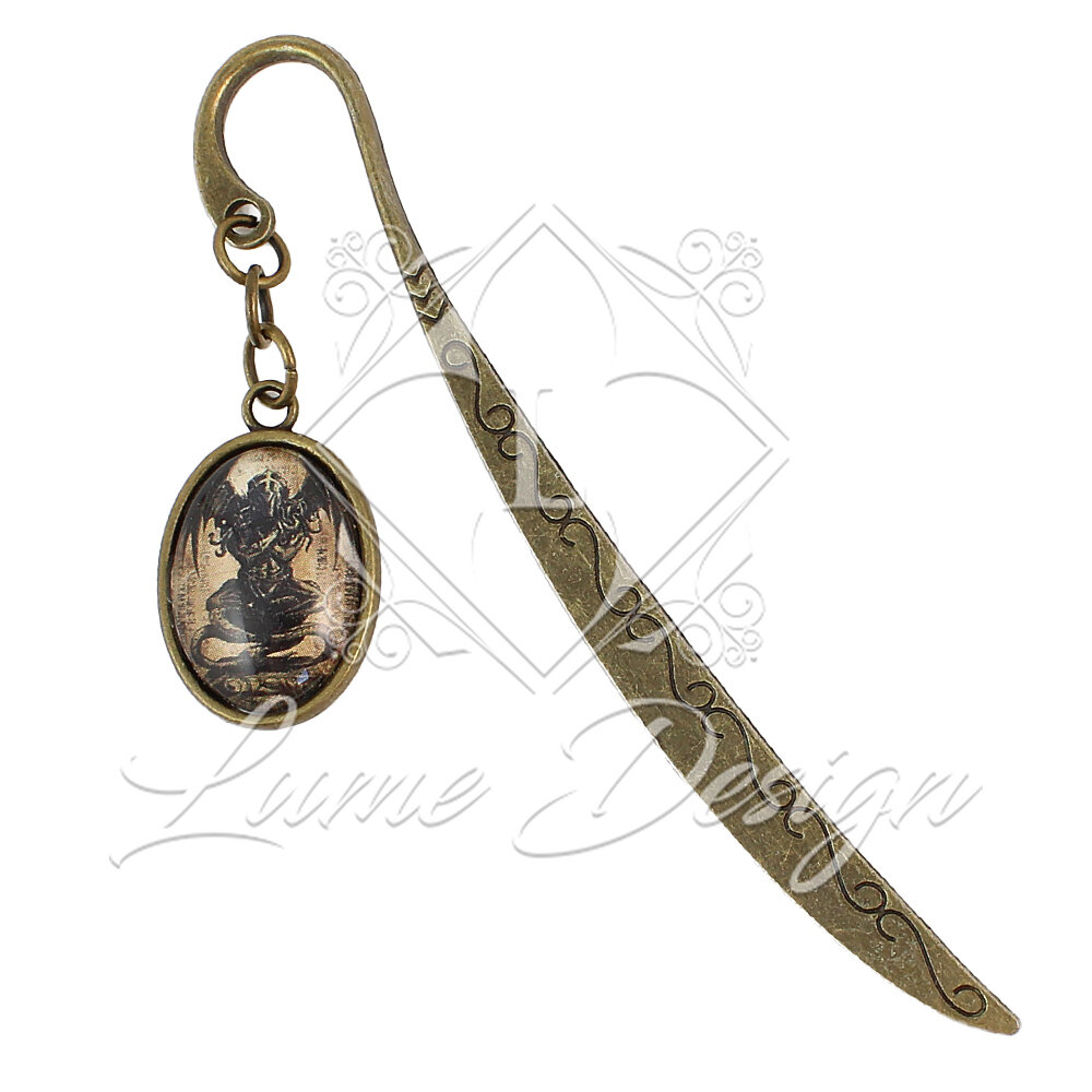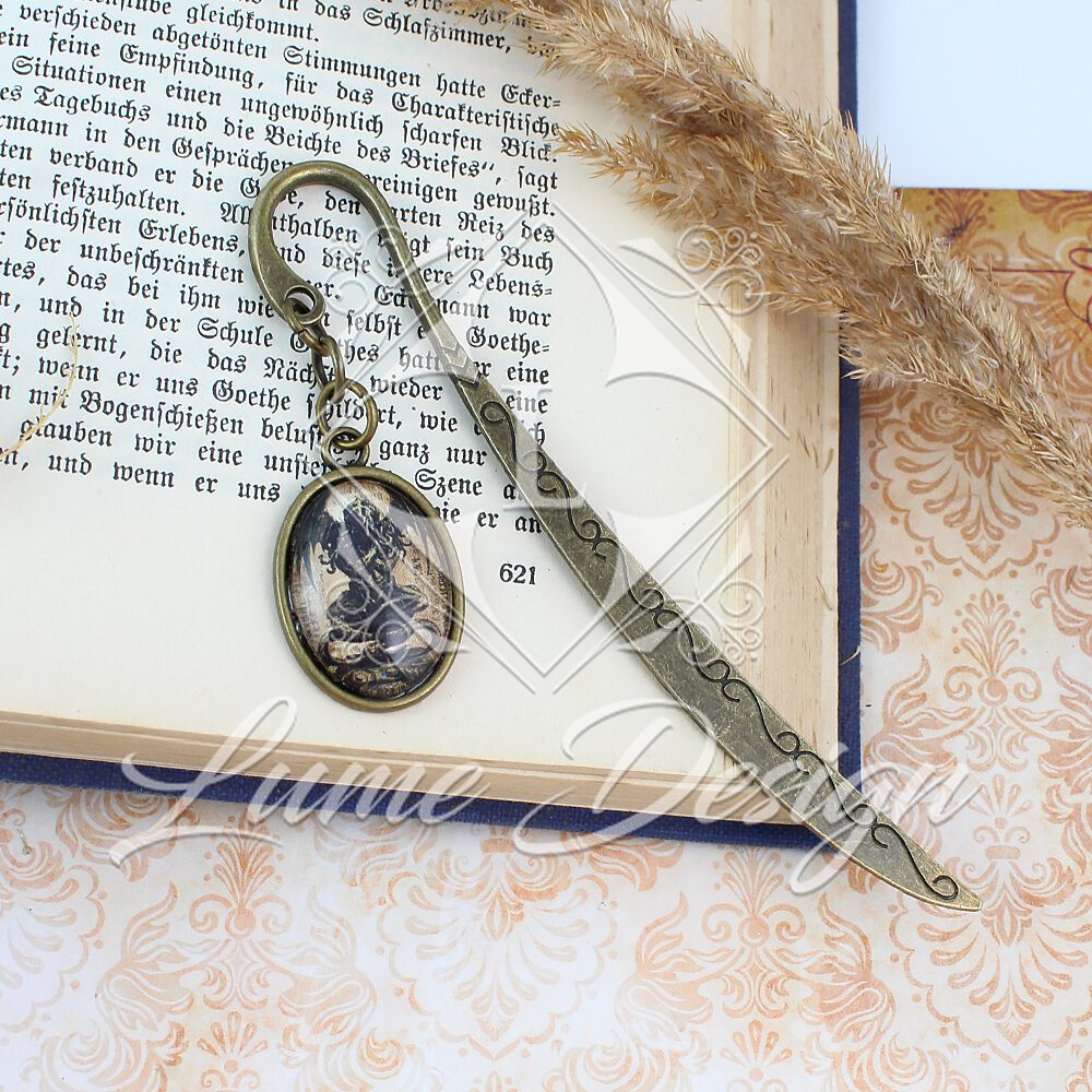 Ręcznie wykonana zakładka do książki, z której bije mrok i aura prastarych tajemnic. Pod owalnym, szklanym kaboszonem kryje się grafika przedstawiająca kultowy posążek (idol) Cthulhu – bezpośrednie nawiązanie do klasyki horroru autorstwa H.P. Lovecrafta.