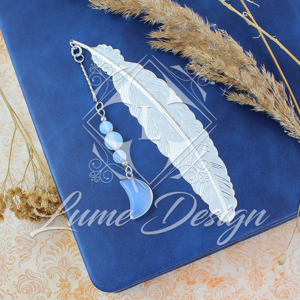 Cienka metalowa zakładka do książki pióro z zawieszką z kamienia opalitu w kształcie księżyca i koralików, w ozdobnym pudełku.