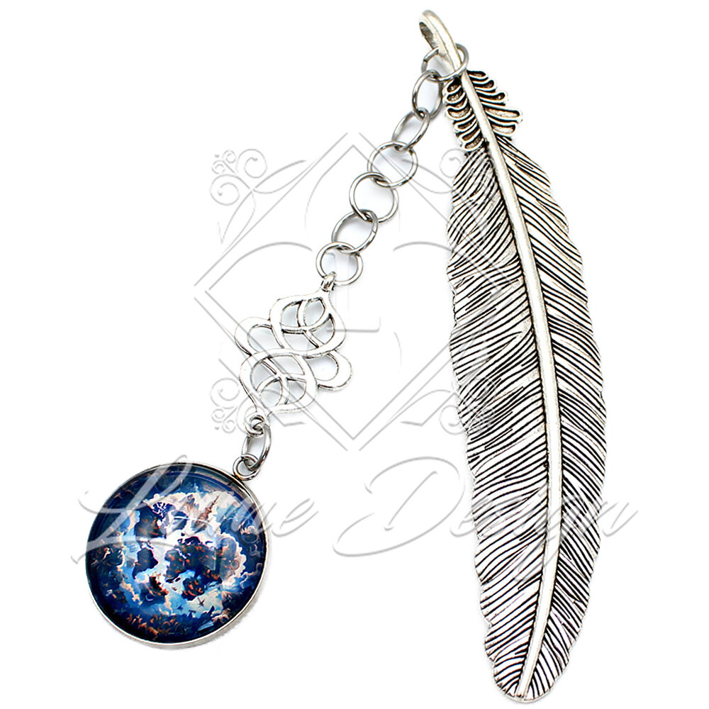 Zakładka do książki w kształcie piórka z autorską grafiką zamkniętą pod wypukłym szkiełkiem. Ręcznie wykonana zakładka, która zachwyci każdego miłośnika podróży i fantastycznych światów.