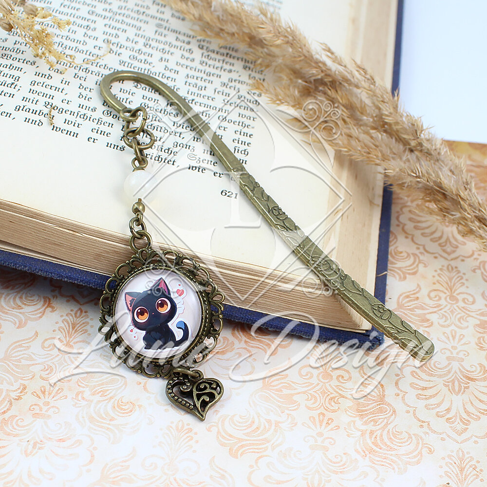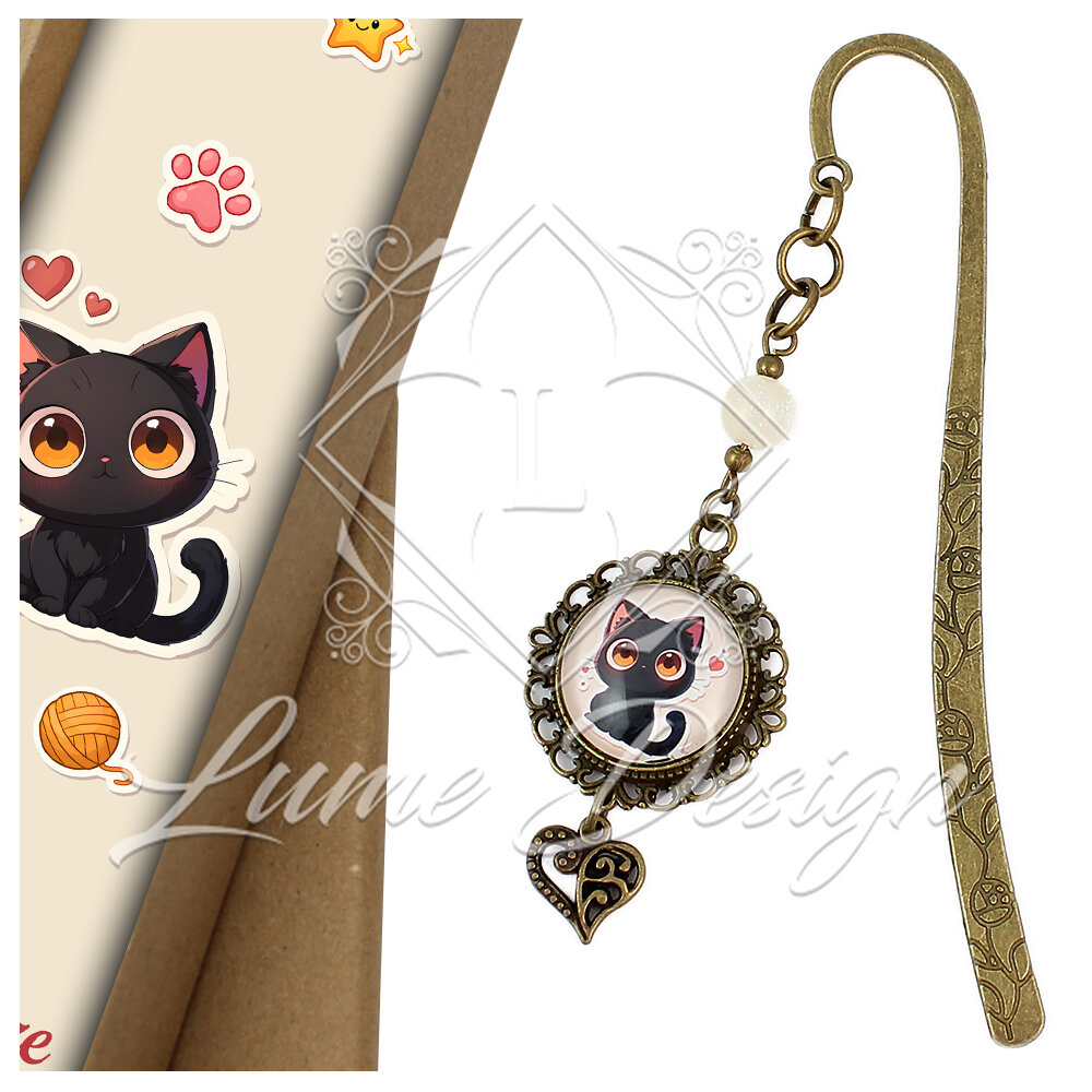 Ręcznie wykonana zakładka stworzona by wywoływać uśmiech przy każdej otwartej książce. Grafika ukryta pod szklanym kaboszonem, w eleganckiej ozdobnej oprawie, przedstawia uroczego czarnego kotka w popularnym stylu anime.