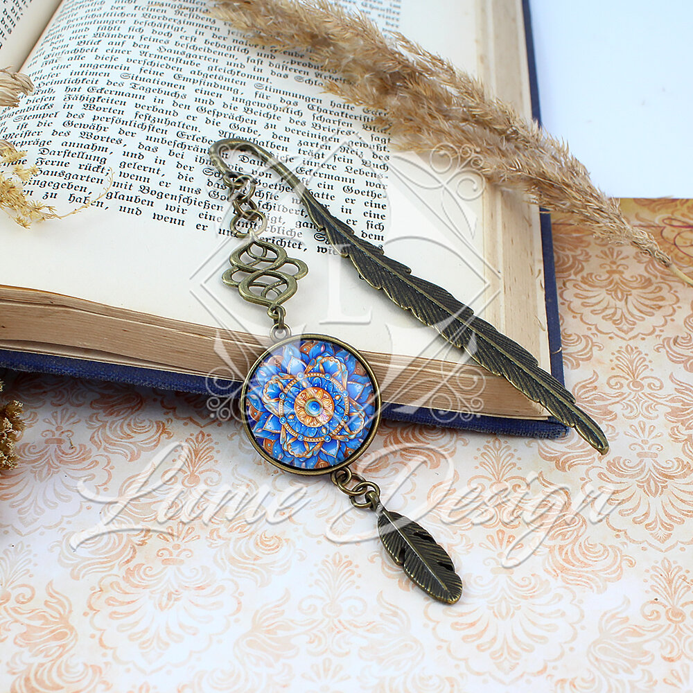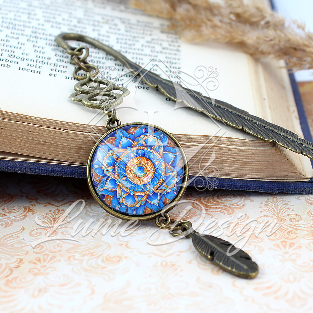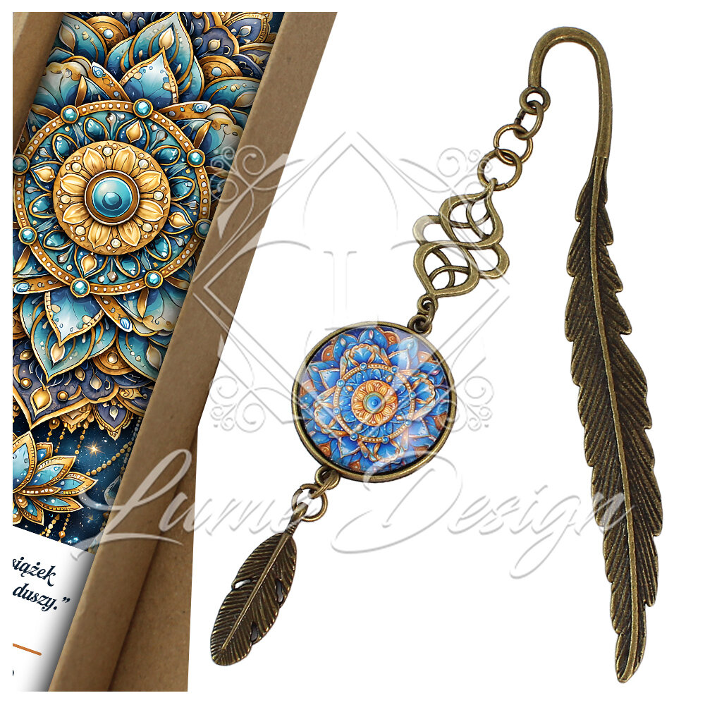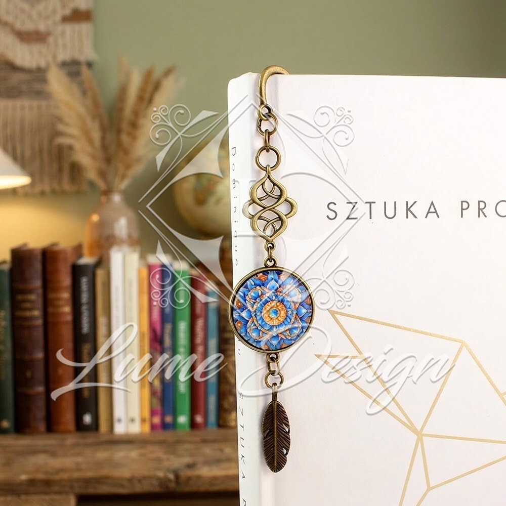 Ręcznie wykonana zakładka do książki, przyciągająca oko skomplikowanym wzornictwem i piękną paletą barw. Grafika pod wypukłym, szklanym kaboszonem przedstawia wielobarwną mandalę przywodzącą na myśl rozkwitający kwiat.