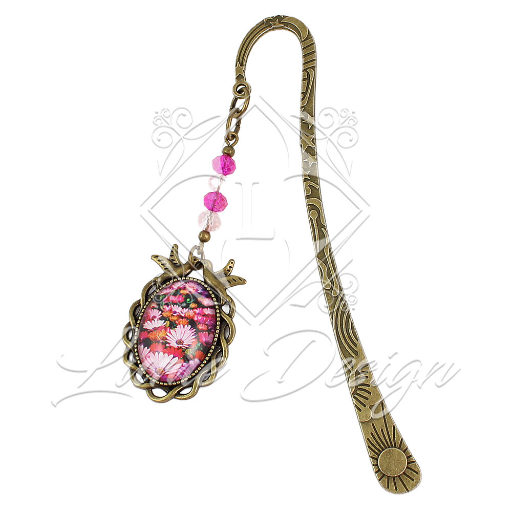 Ręcznie wykonana zakładka do książki o niezwykle radosnym i promiennym charakterze. Grafika zamknięta pod owalnym, szklanym kaboszonem przedstawia kwitnącą łąkę.